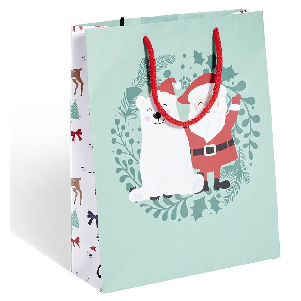 Kjo çantë mesatare me një printim me temë natyre është ideale për të mbajtur një ose më shumë dhurata për Krishtlindje.
