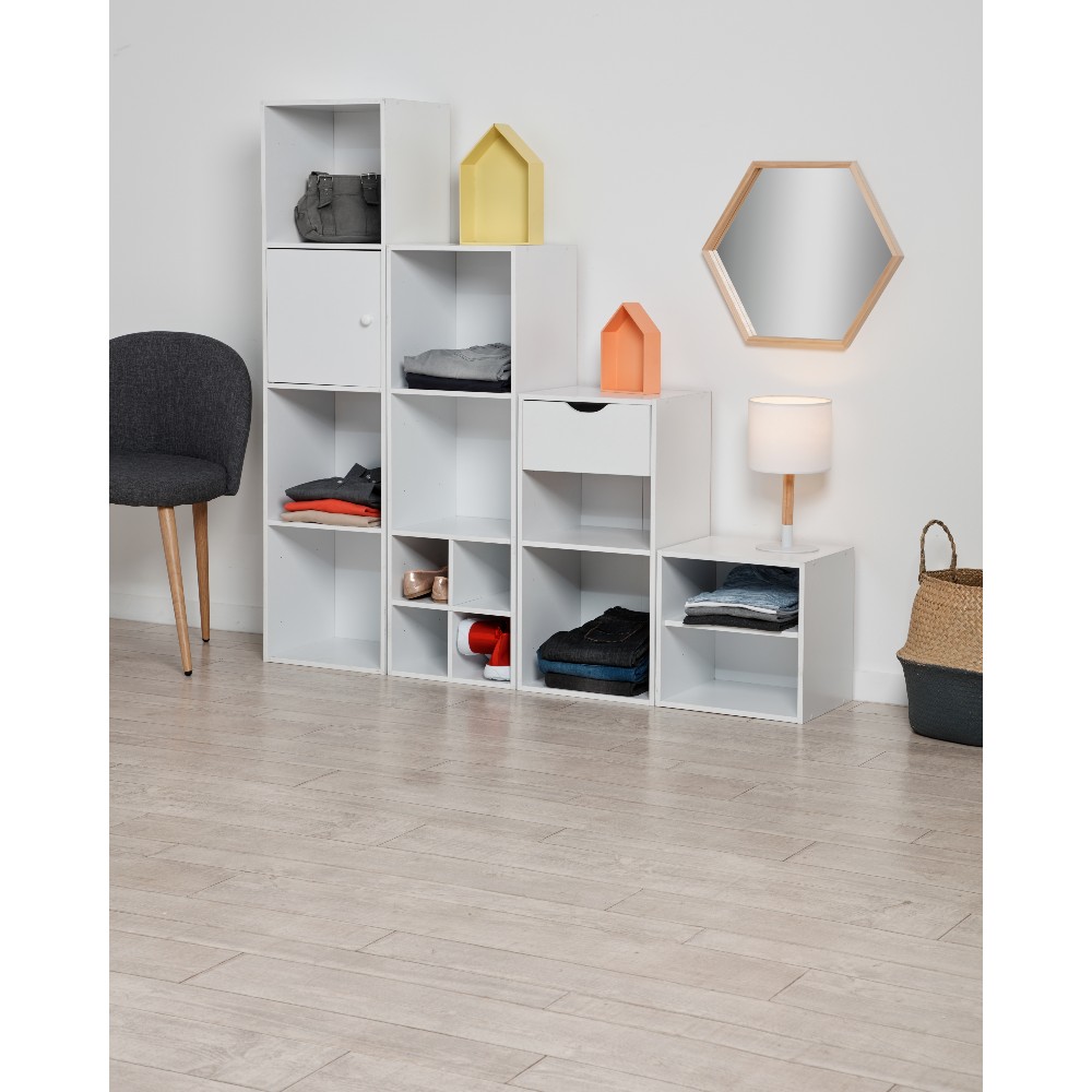 Ky kub magazinimi me 1 kub, i bërë nga dërrasë grimcash e bardhë, është ideal për të maksimizuar hapësirën tuaj të magazinimit në çdo dhomë të shtëpisë. Plotësojeni atë me një derë, raft, sirtar ose kube të tjera nga e njëjta gamë për të krijuar një seri të personalizuar magazinimi.