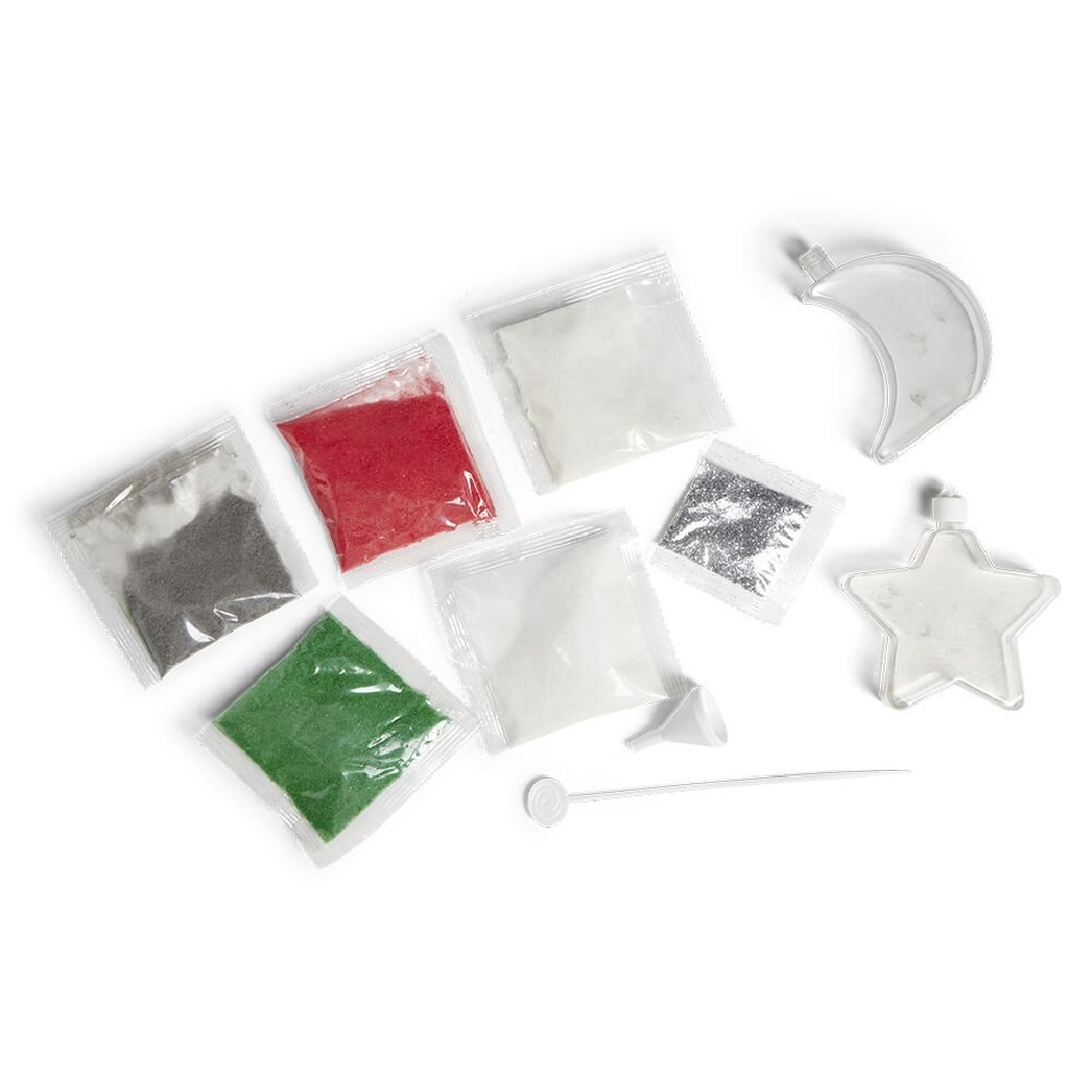Kit krijues për të bërë 2 stoli të bukura Krishtlindjesh nga rëra fosforeshente, njëra në formën e një hëne dhe tjetra në formën e një ylli.