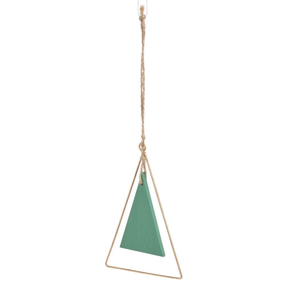 Shtoni një prekje elegante dekorit tuaj të Krishtlindjeve duke varur këtë trekëndësh metalik të artë me një trekëndësh të gjelbër brenda.