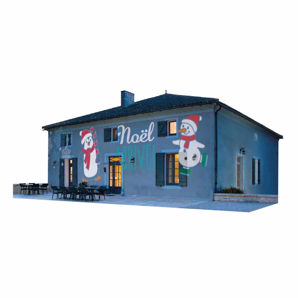 Zbukuroni murin tuaj të jashtëm me këtë projektor LED që transmeton mesazhin "Krishtlindjet po vijnë" i shoqëruar nga një burrë dëbore, një pinguin dhe flokë dëbore.