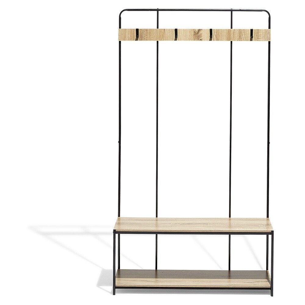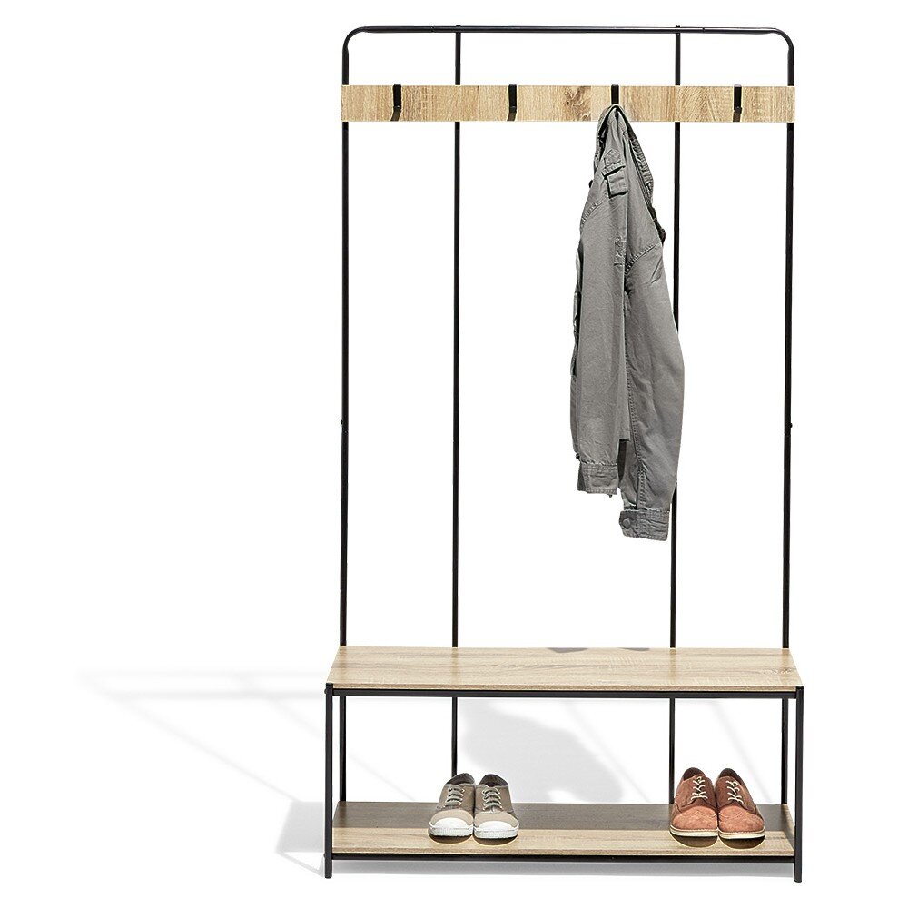 Maksimizoni hapësirën e ruajtjes në hyrje me këtë raft elegant rrobash prej metali dhe druri. Ky raft praktik rrobash ju lejon të ruani lehtësisht xhaketa dhe këpucë falë katër grepave dhe zonës së dedikuar për ruajtjen e këpucëve.
