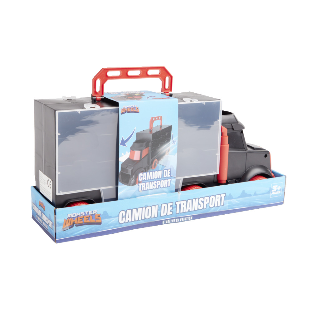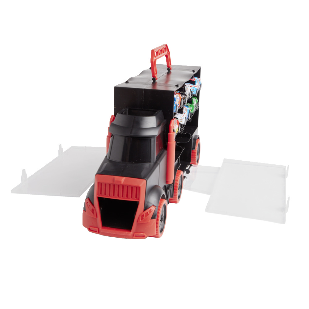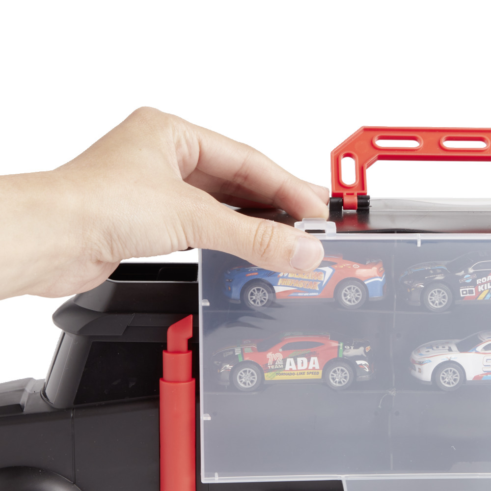 Ky kamion transporti me 6 makina miniaturë është perfekt për orë të tëra loje dhe organizimi.