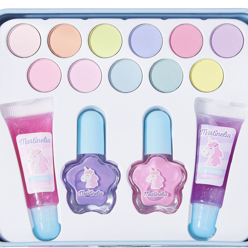Kuti metalike për grim Martinelia Little Unicorn me 11 hije sysh, 2 shkëlqyes buzësh dhe 2 manikyrësh.