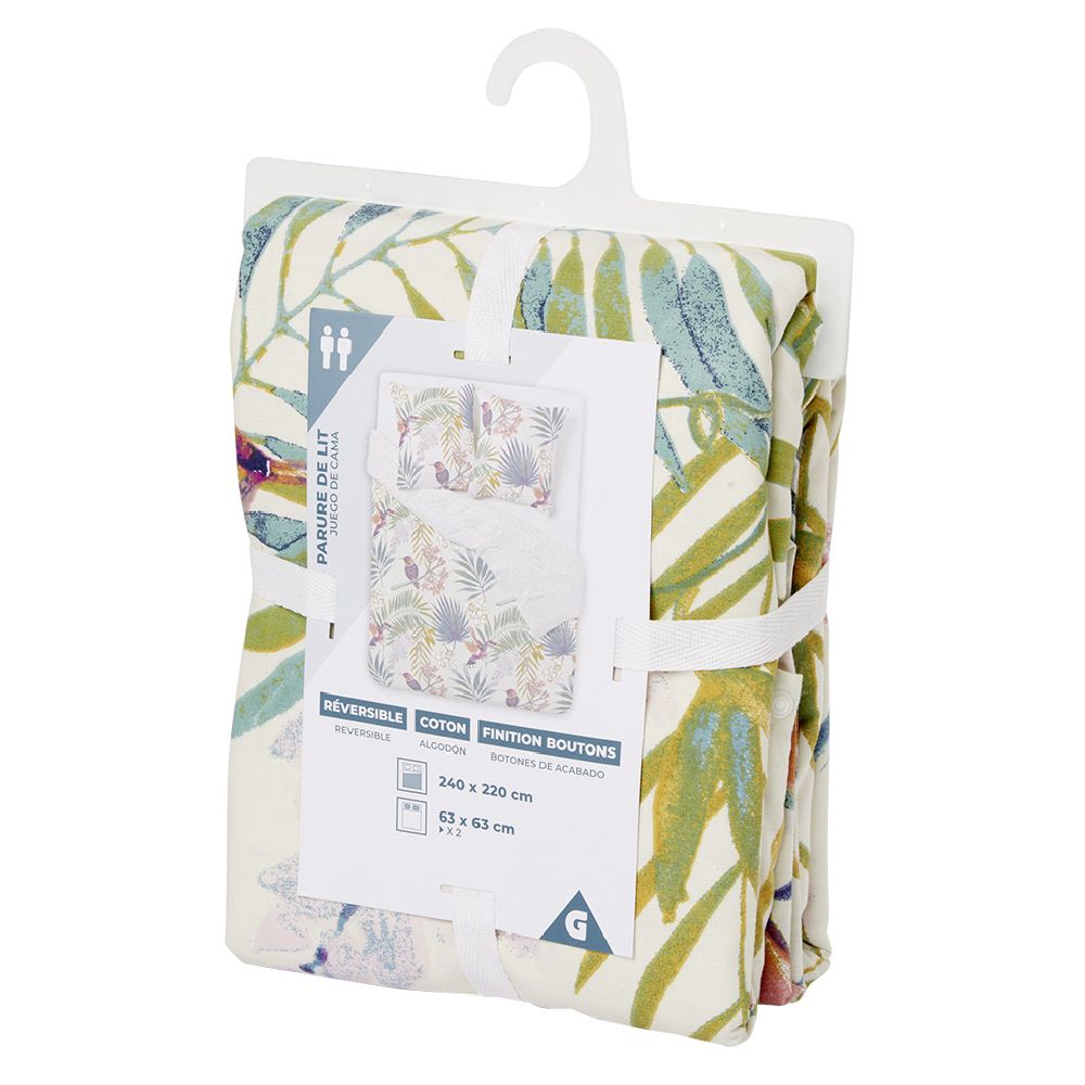 Reversible cotton bedding set for a double bed with tropical bird patterns and button detailing.