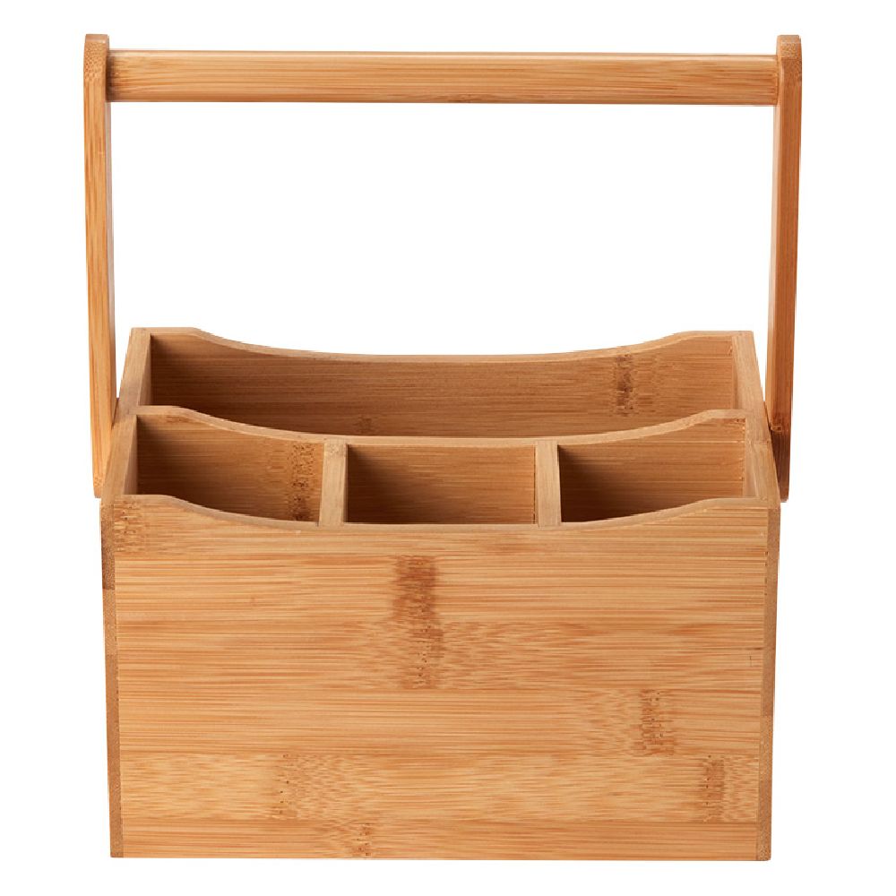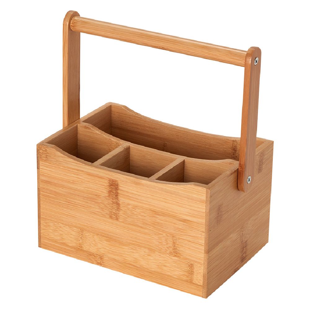Ruani takëmet tuaja drejt në këtë kuti bambuje me ndarje. Me dizajnin e saj natyral dhe dorezën e gjerë, është e lehtë për t'u lëvizur në banak, karrocë servirjeje ose tavolinë.