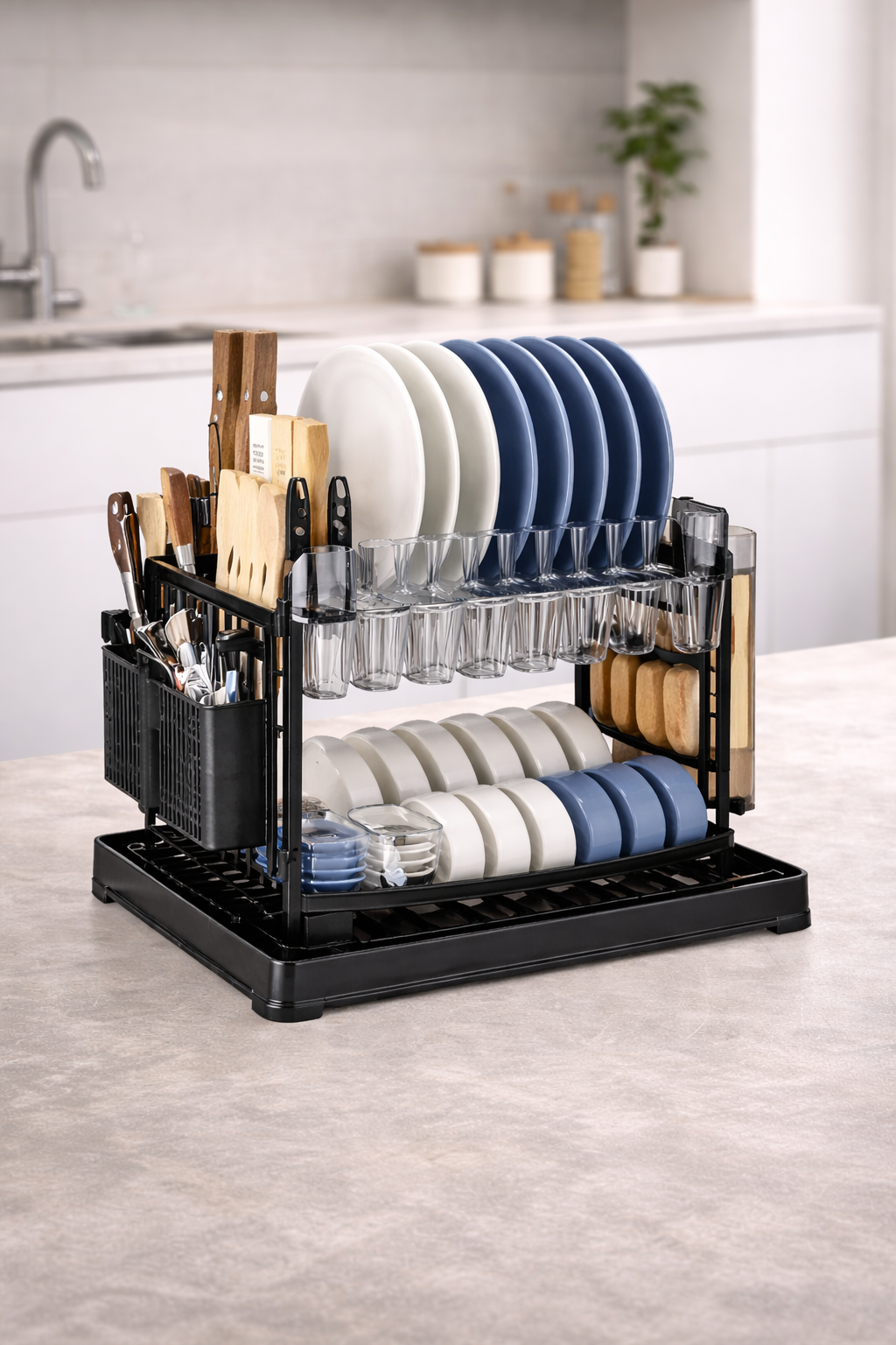 Kulluese enësh shumëfunksionale e dizajnuar për tharjen dhe organizimin e enëve pas larjes. Dizajni praktik ndihmon në mbajtjen e enëve të rregulluara dhe lejon kullimin e ujit në mënyrë efikase, duke e bërë një aksesor të dobishëm për çdo kuzhinë.