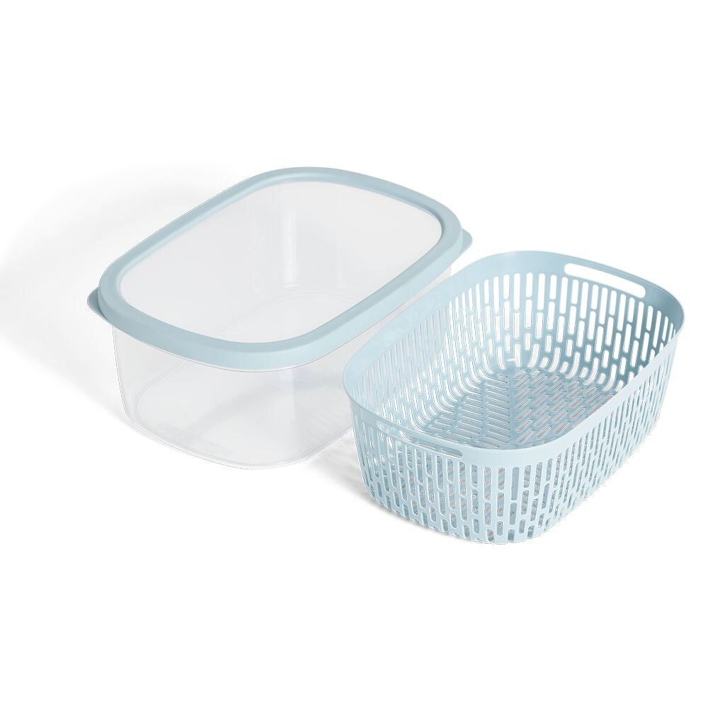 Kjo enë transparente ushqimi me një shportë freskie do t'ju ndihmojë të mbani perimet më të freskëta për më gjatë në frigorifer. Gjithashtu, mund të përdorni shportën e lëvizshme për të larë dhe kulluar frutat dhe perimet tuaja.