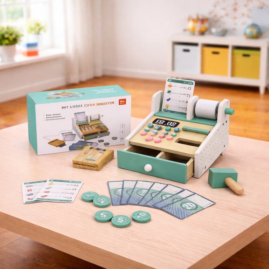 Lodër arkë fiskale nga druri është lodër edukative dhe argëtuese për fëmijë. Ajo ndihmon në zhvillimin e imagjinatës, aftësive sociale dhe njohjes bazë të numrave përmes lojës imituese të blerjes dhe shitjes. E punuar nga dru cilësor dhe i qëndrueshëm, është e përshtatshme për përdorim të përditshëm dhe lojë të sigurt.
