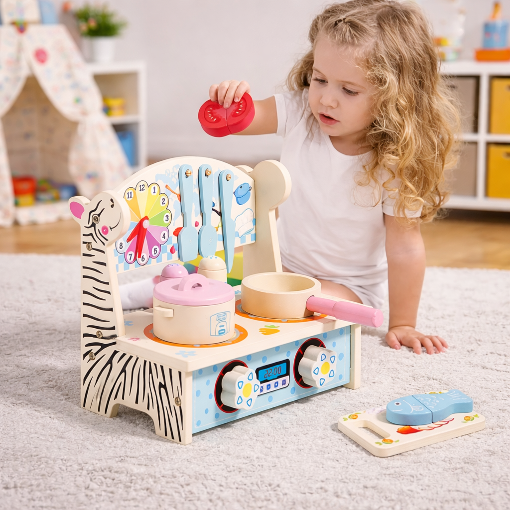 Lodër mini kuzhinë nga druri është lodër kreative dhe edukative për fëmijë. Ajo ndihmon në zhvillimin e imagjinatës, aftësive sociale dhe koordinimit përmes lojës imituese. E punuar nga dru cilësor dhe i qëndrueshëm, është e sigurt për përdorim dhe ideale për argëtim të përditshëm në shtëpi.