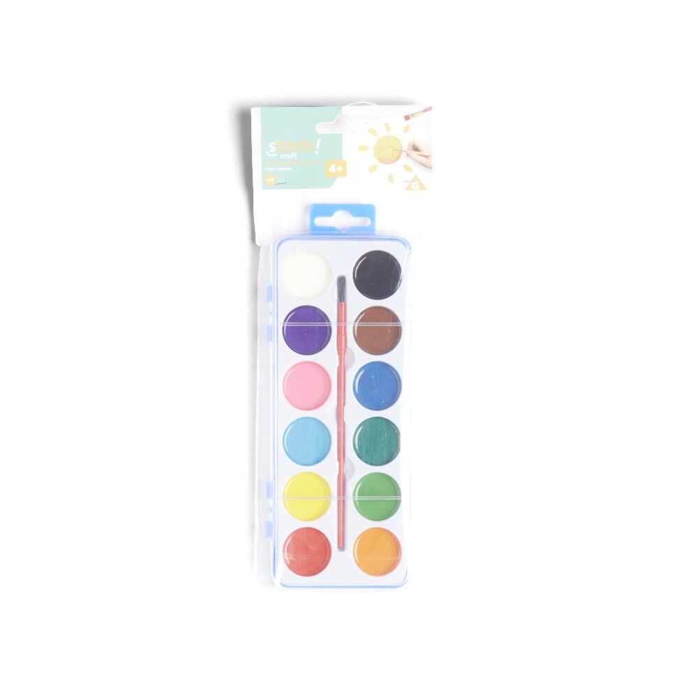 Paletë ngjyrash e përbërë nga 12 ngjyra dhe 1 furçë, ideale për hobet tuaja krijuese.