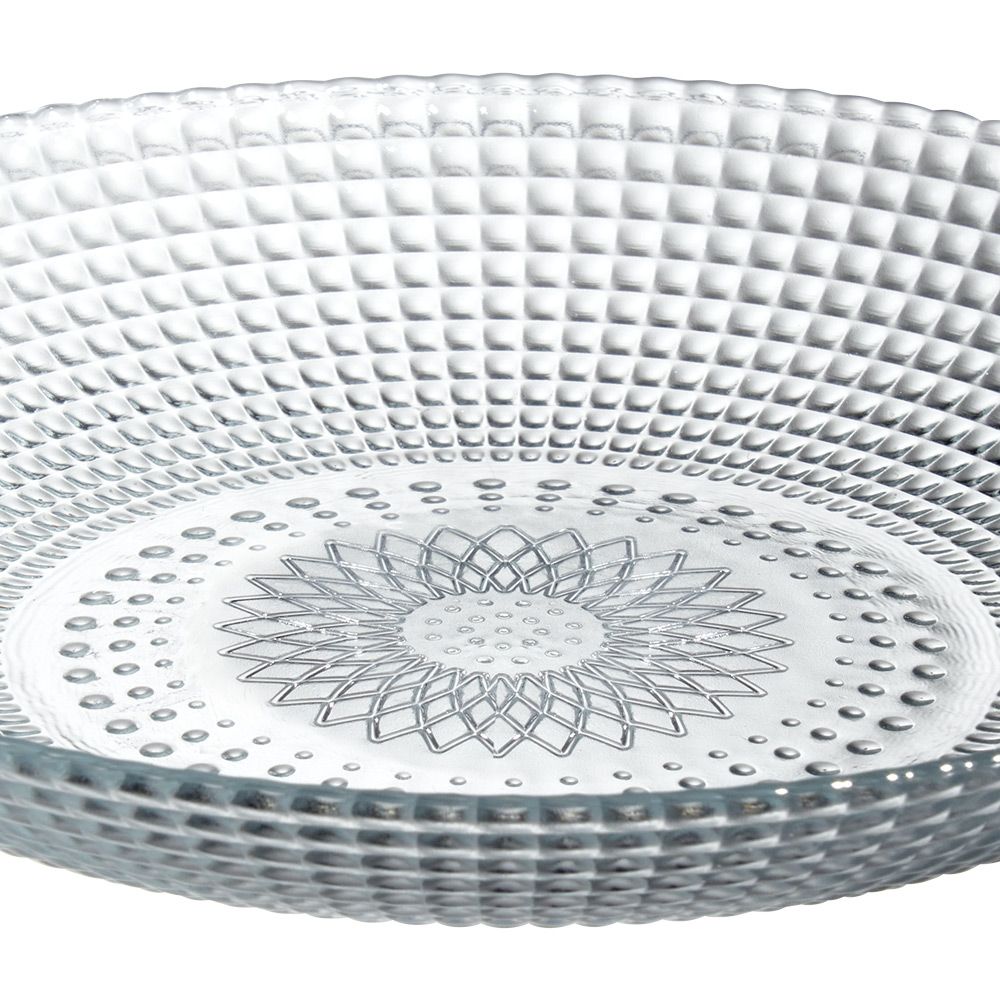 Pjatë e thellë në formë të rrumbullakët me reliev të bardhë transparent.