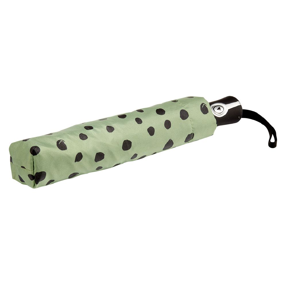 Çadër e tërheqshme jeshile me pika të zeza, për t'ju mbrojtur nga shiu.