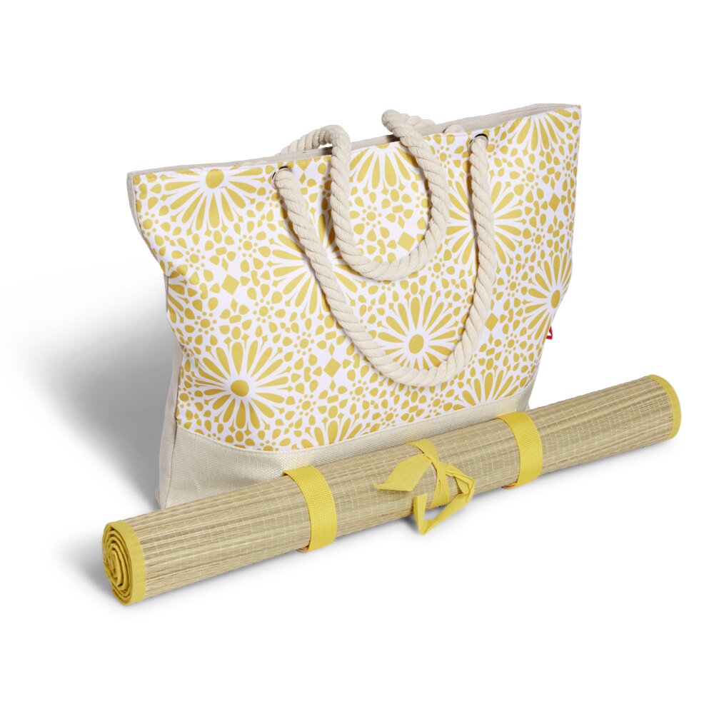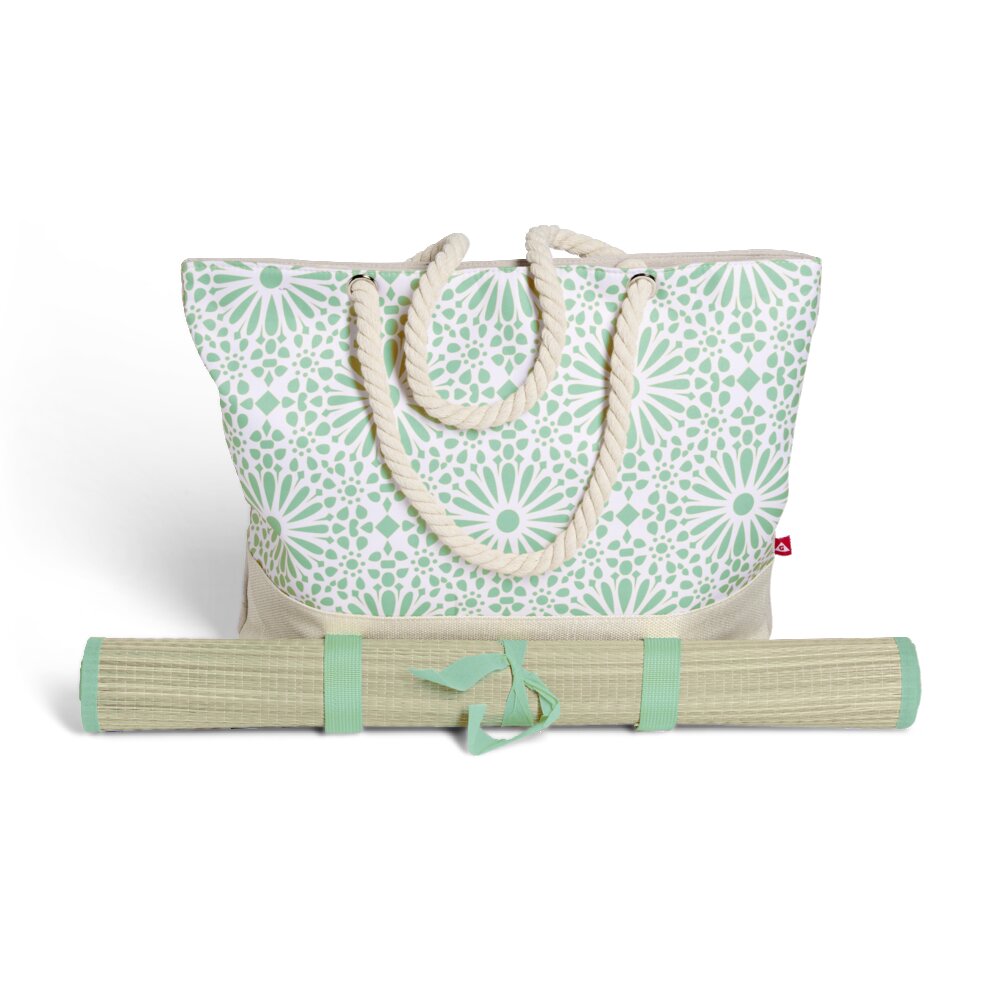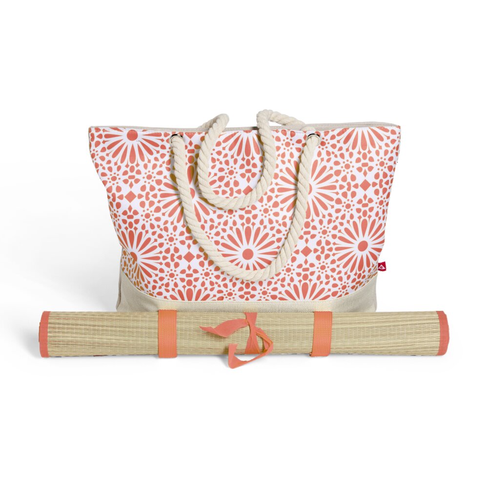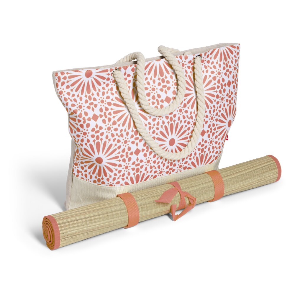 Zbuloni këtë çantë plazhi prej poliesteri rozë dhe të bardhë, të shoqëruar nga një dyshek kashte i gjerë, perfekt për t'u çlodhur në diell.