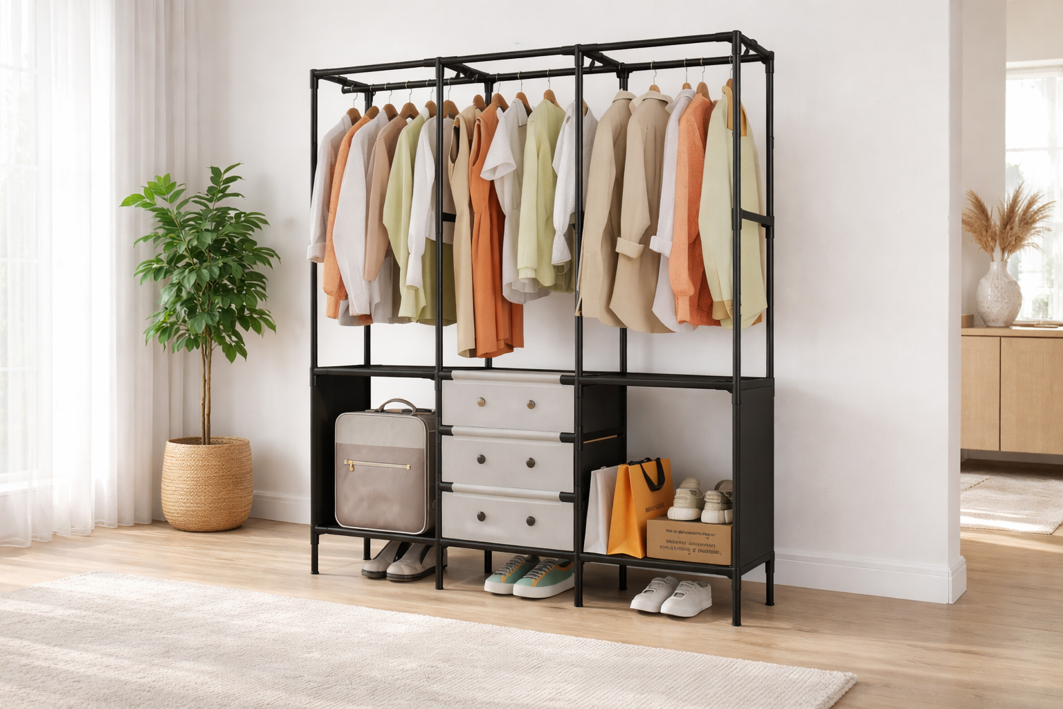 Raft Organizues për Rroba është zgjidhje praktike për organizimin dhe ruajtjen e rrobave në mënyrë të rregullt. Ai ndihmon në shfrytëzimin më të mirë të hapësirës në dollap ose në dhomë, duke mbajtur rrobat të sistemuara dhe lehtësisht të qasshme. Dizajni funksional e bën ideal për përdorim në shtëpi, garderobë apo dhoma të ndryshme.