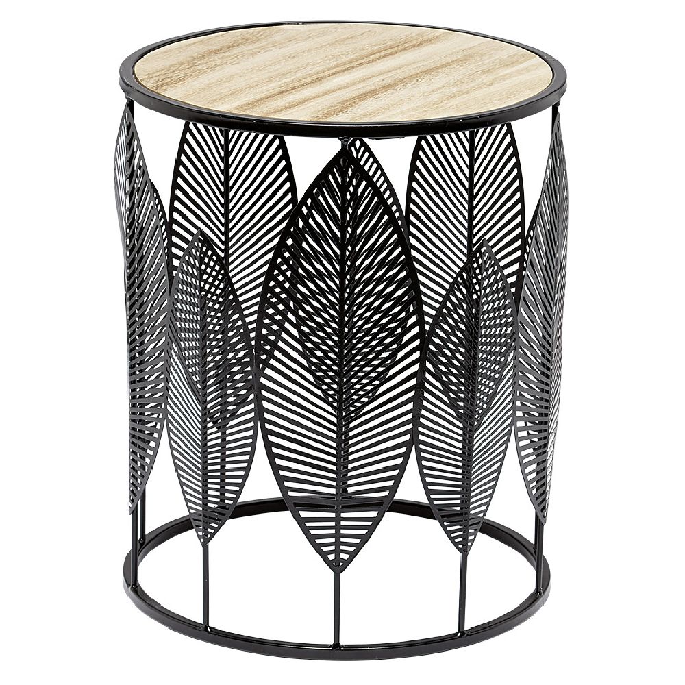 Tavolinë anësore e shkëlqyer me strukturë metalike me dizajn gjethesh të zeza dhe sipërfaqe prej pishe natyrale.