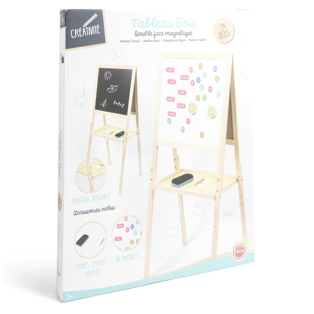 Kjo dërrasë druri me dy anë, me njërën anë magnetike dhe tjetrën me propozoj, është ideale për të stimuluar të nxënit dhe kreativitetin e fëmijëve.