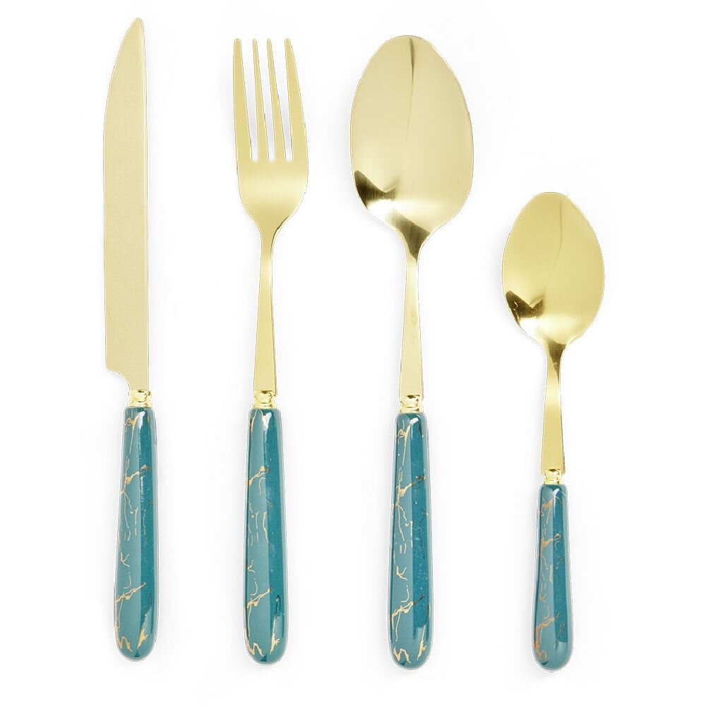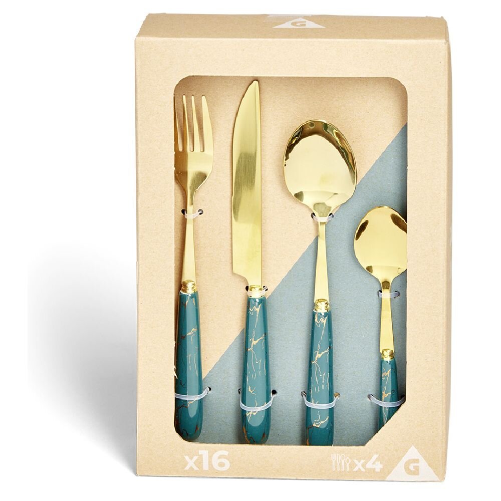 Add a chic touch to your table setting with this cutlery set consisting of 16 gold cutlery pieces with black or green marble effect handles (4 forks, 4 knives, 4 tablespoons, 4 teaspoons).