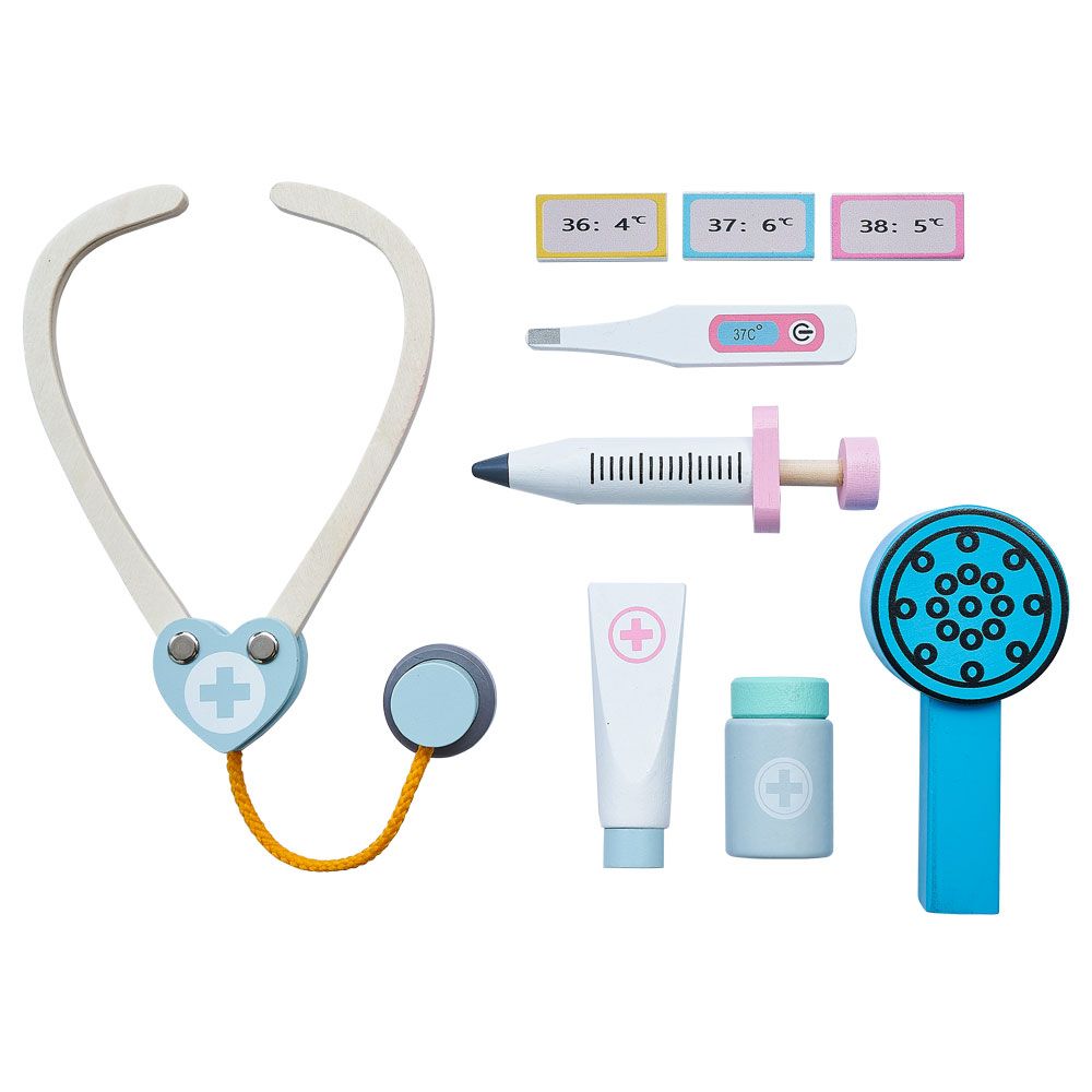 - Front: veterinary stand with 9 wooden accessories