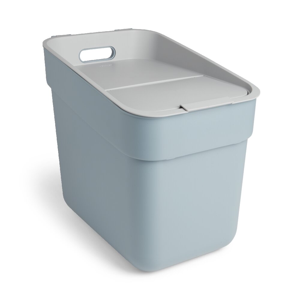 Equip yourself to efficiently sort your waste with this blue bin with a light gray lid.