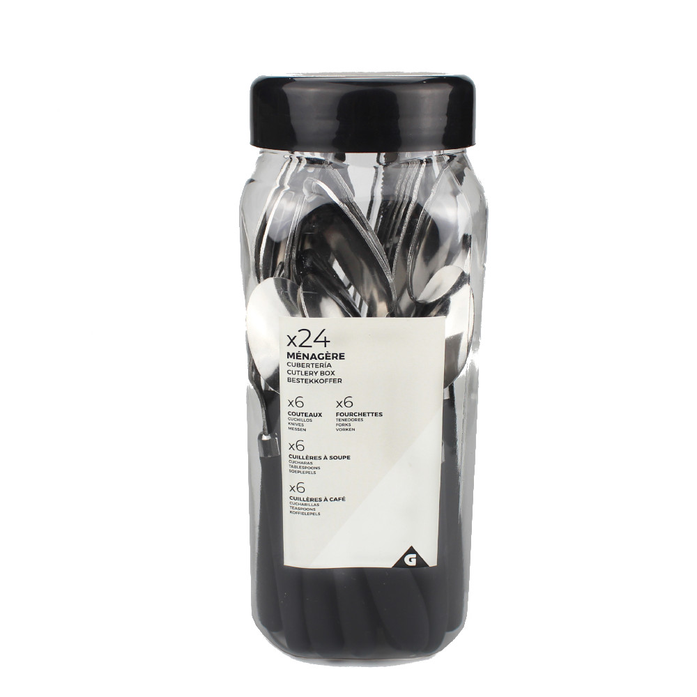 Cutlery set consisting of 24 stainless steel cutlery pieces with non-slip soft-touch handles in black.