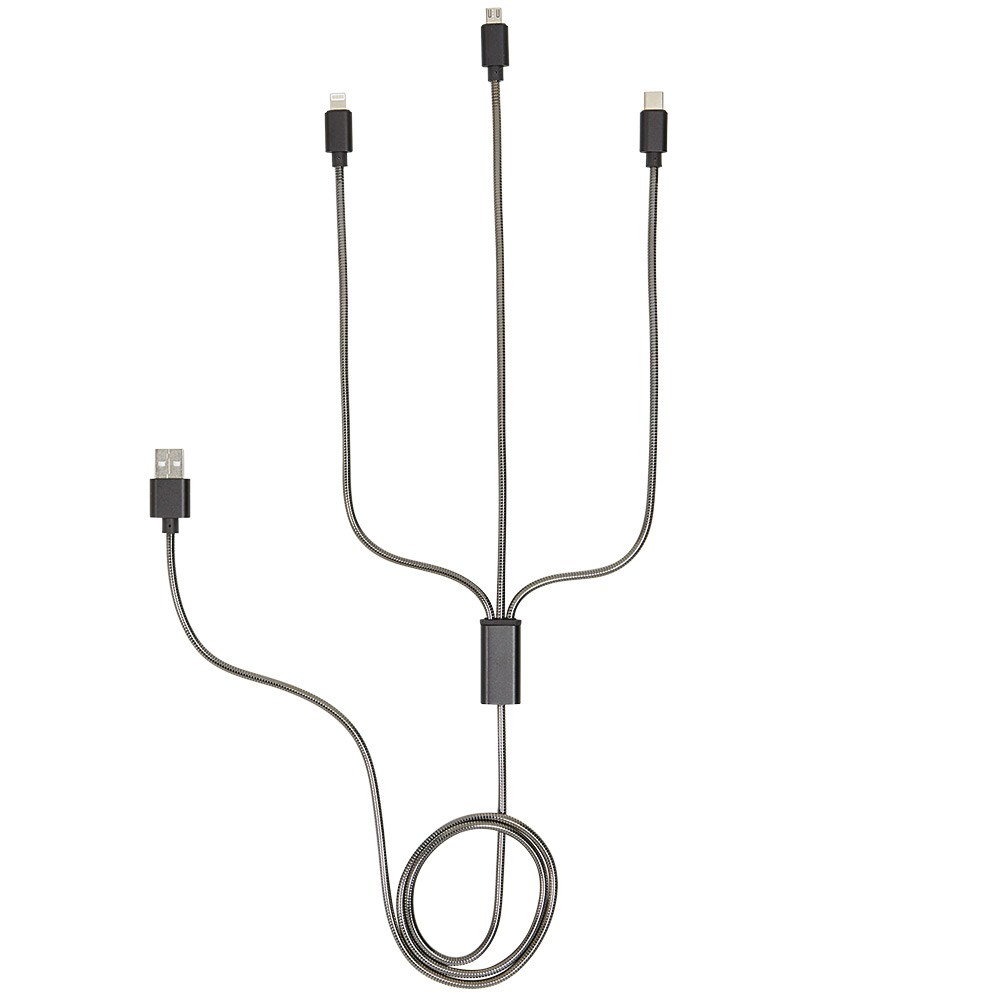 Never run out of battery power again, whatever your device, thanks to this 3-in-1 metal adapter with a length of 1 m! It has a USB input and 3 different outputs: - 1 USB-C output - 1 micro USB output - 1 Lightning output