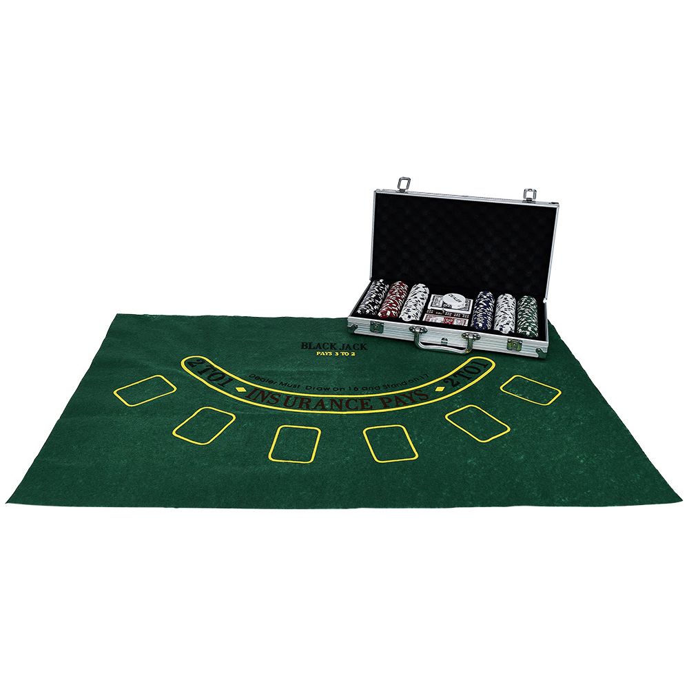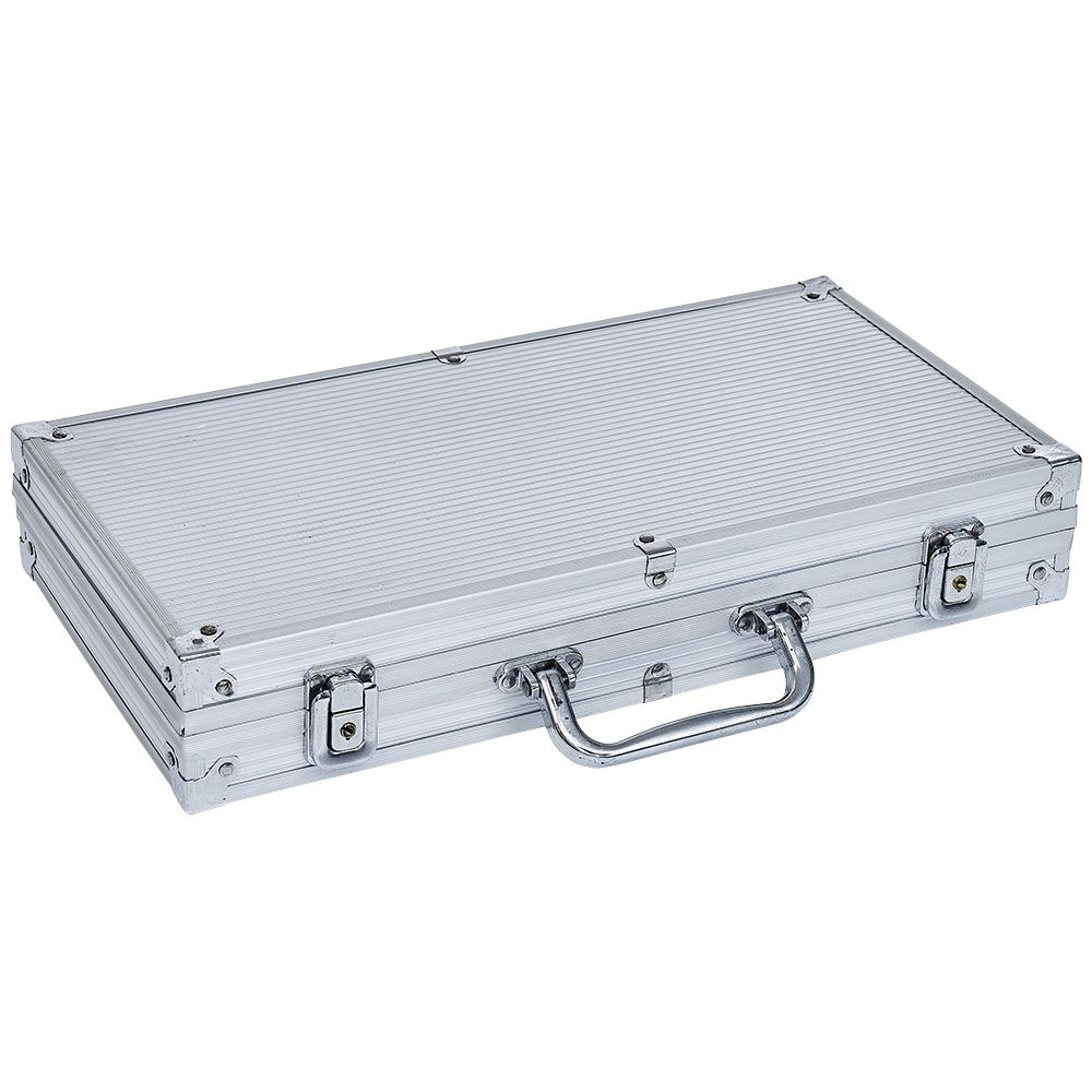 Aluminum poker case including 1 game mat, 300 chips, 2 decks of cards, 5 dice, 1 dealer chip and 1 set of keys.