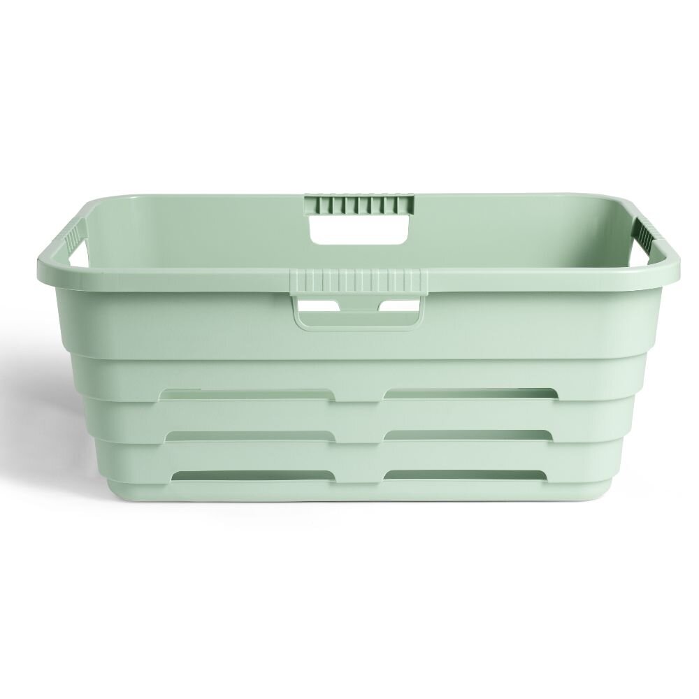 Green plastic laundry basket with openwork design and integrated handles on all 4 sides for easy transport.