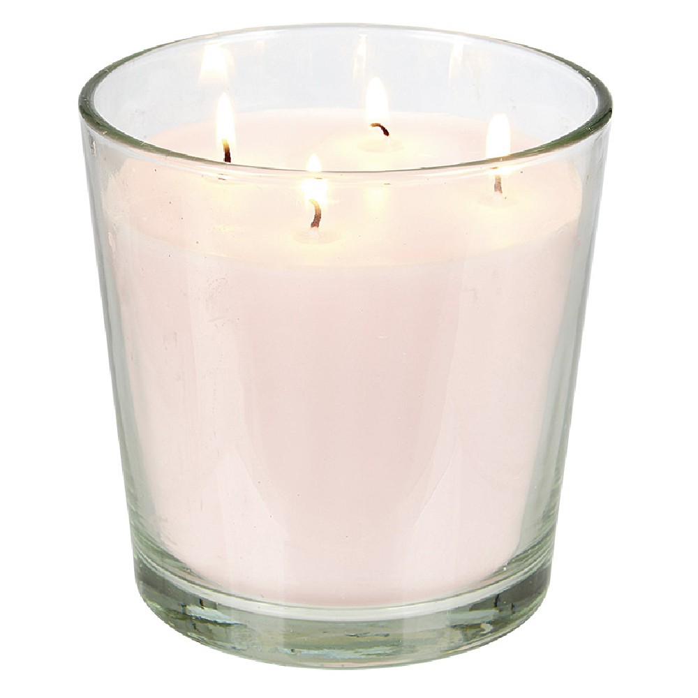 For a cozy atmosphere, light this pink 4-wick passion scented candle in its transparent glass.