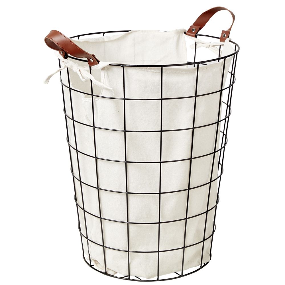 Ideal for your dirty laundry, this openwork black steel laundry basket comes with a removable cotton bag that's machine washable at 30°C. Easy to carry, it features two brown faux leather handles.