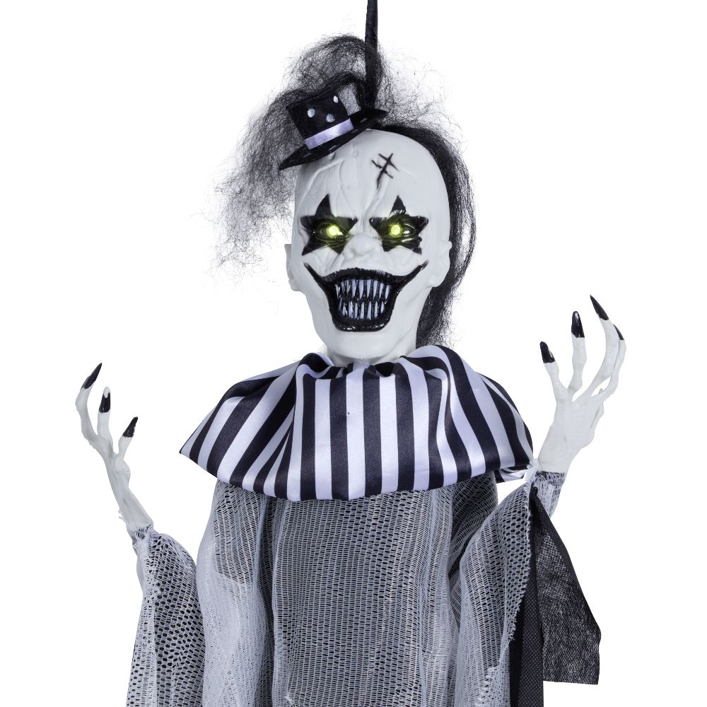Demonic hanging animated clown. Perfect for scaring your guests during Halloween.
