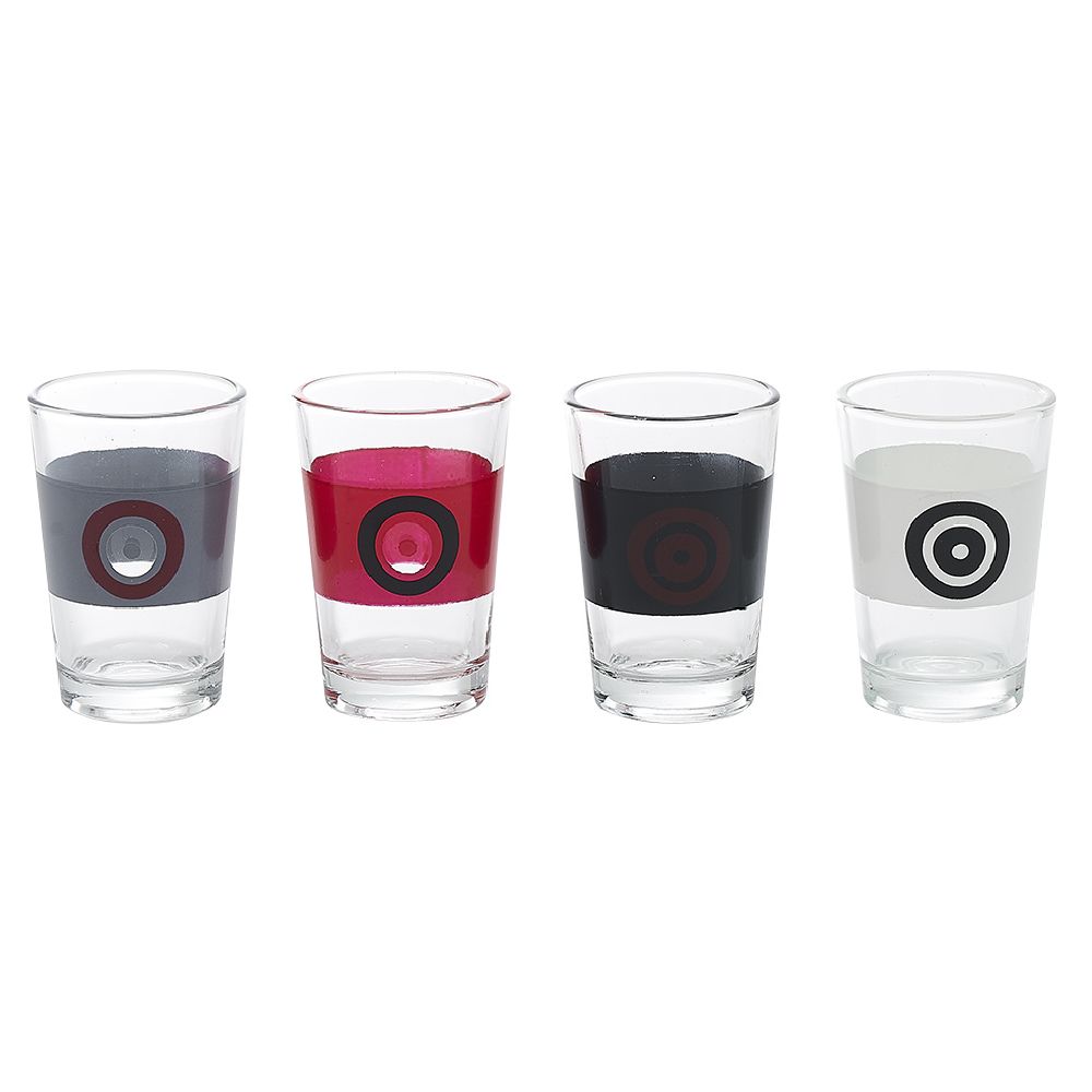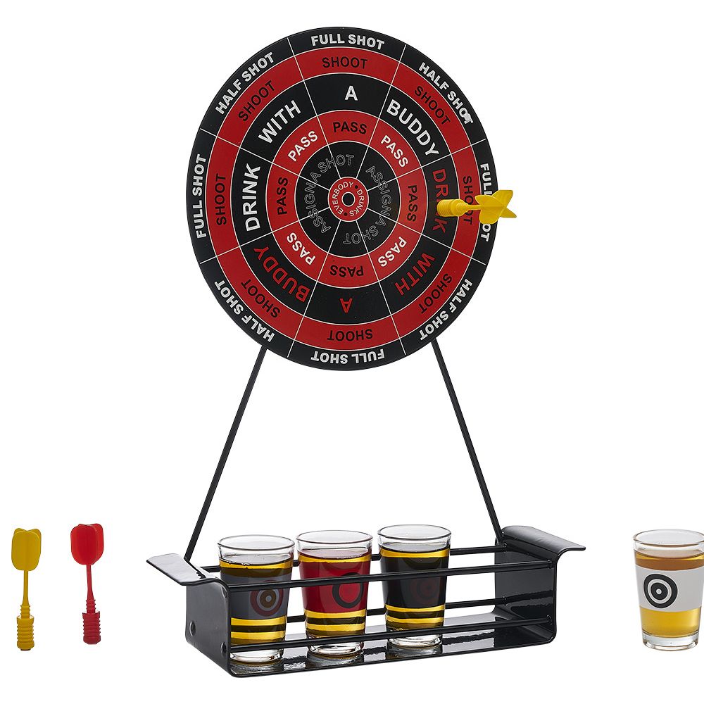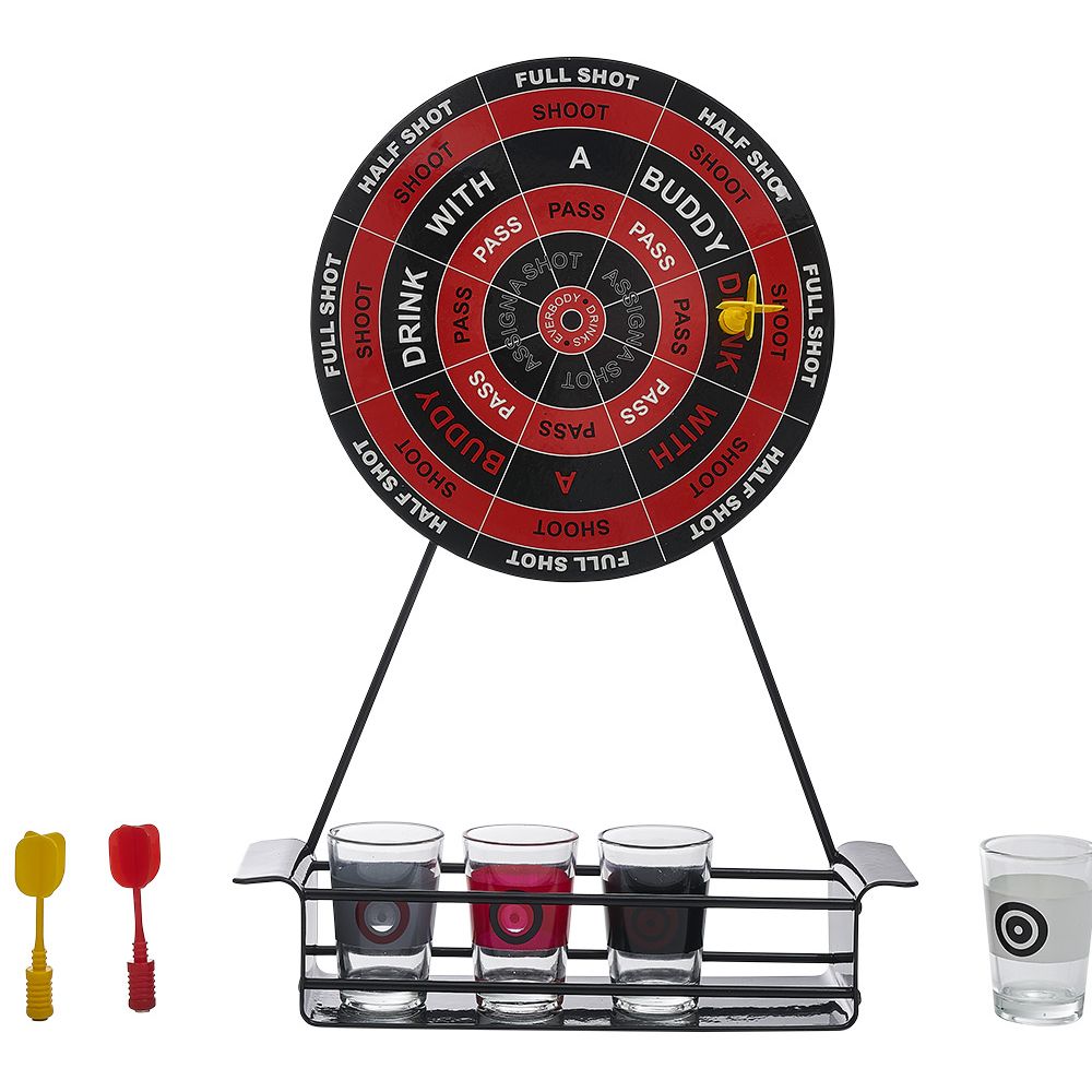 This drinking game includes 1 metal target with pledges, 4 magnetic darts and 4 shot glasses.