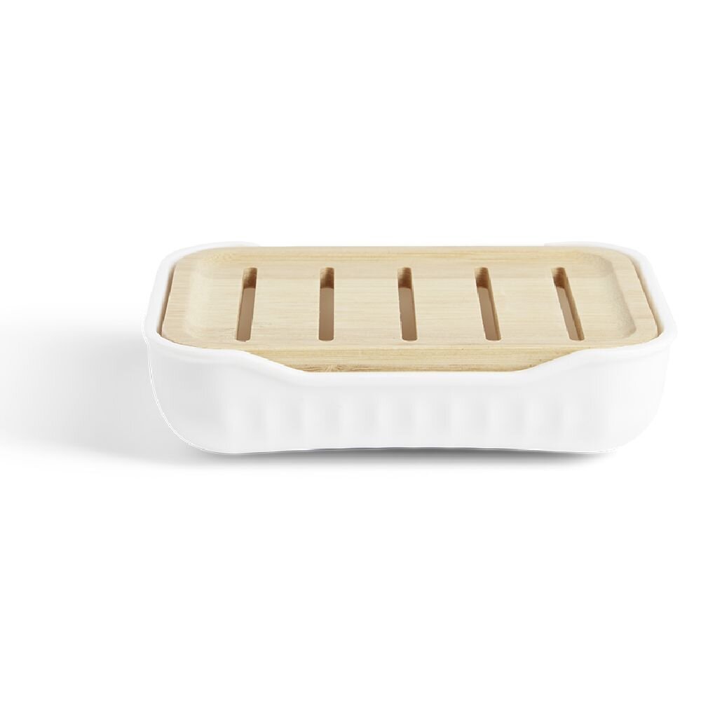 This soap dish combines elegance and practicality with its white polypropylene base and natural bamboo tray.