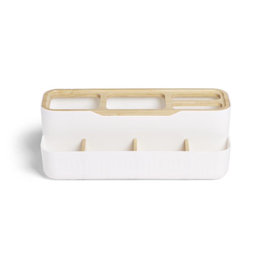 This bathroom storage unit combines style and functionality with its white plastic structure separated by bamboo compartments.