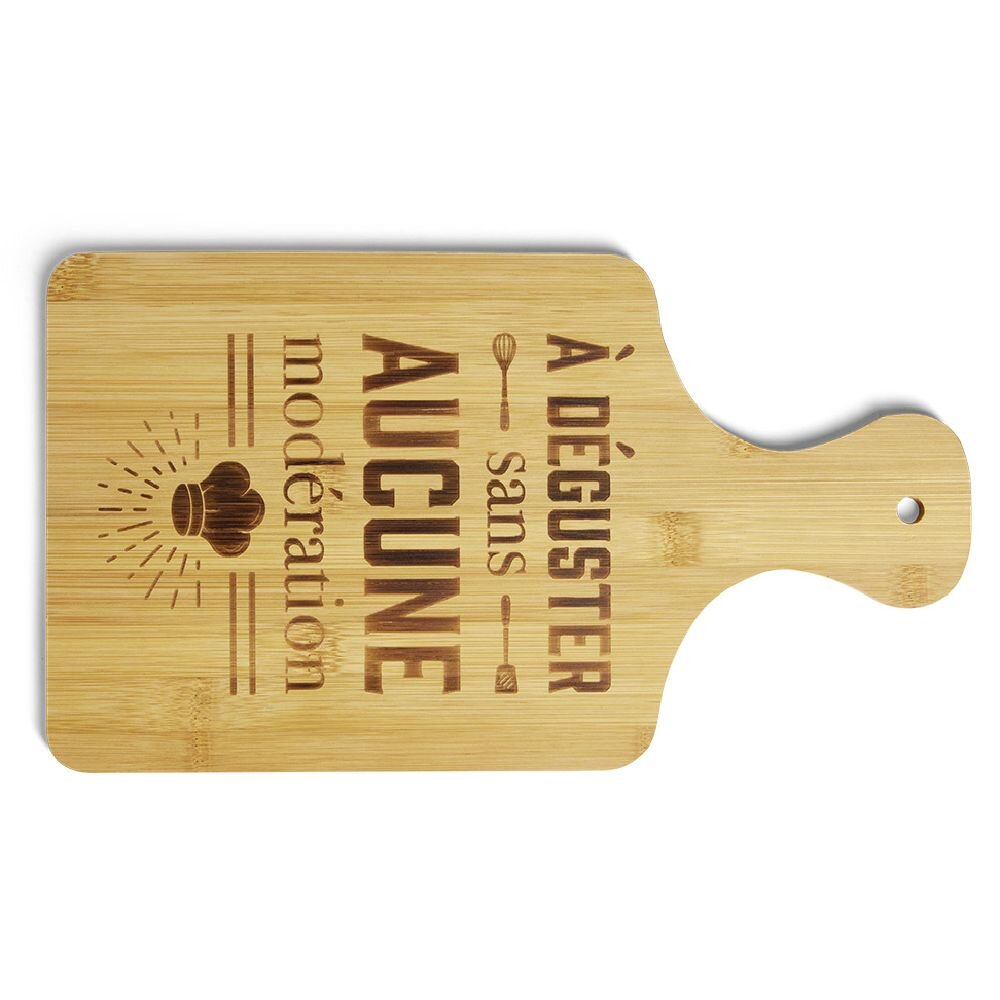 Ideal for cutting your food and presenting your appetizers, this bamboo cutting board with handle will quickly become your favorite. It can also be a decorative element in your kitchen thanks to its inscription "To be enjoyed without any moderation".