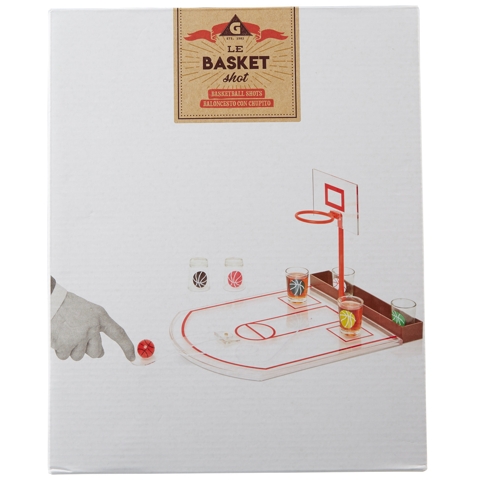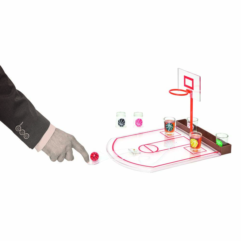 Mini basketball court drinking game comes with 1 ball and 4 shot glasses. Practice and challenge your friends for long games and crazy evenings! The player who scores a basket then makes the person of his choice drink .