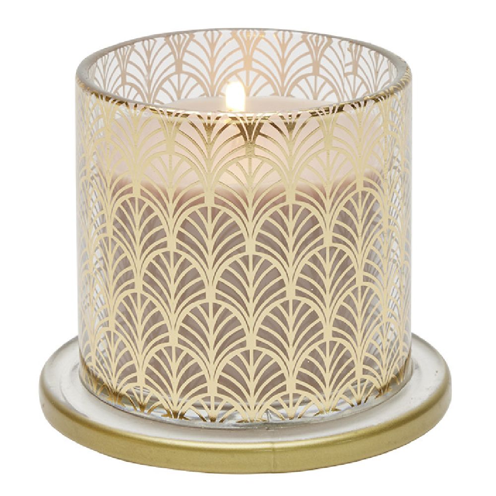 Beige candle with amber scent presented under a transparent bell jar in a pretty glass jar with a golden design.