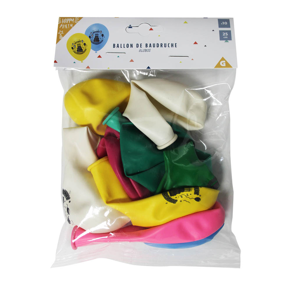 10 balloons in various colors with "Happy Birthday" written on them, 25 cm in diameter. Different models, availability depends on availability.