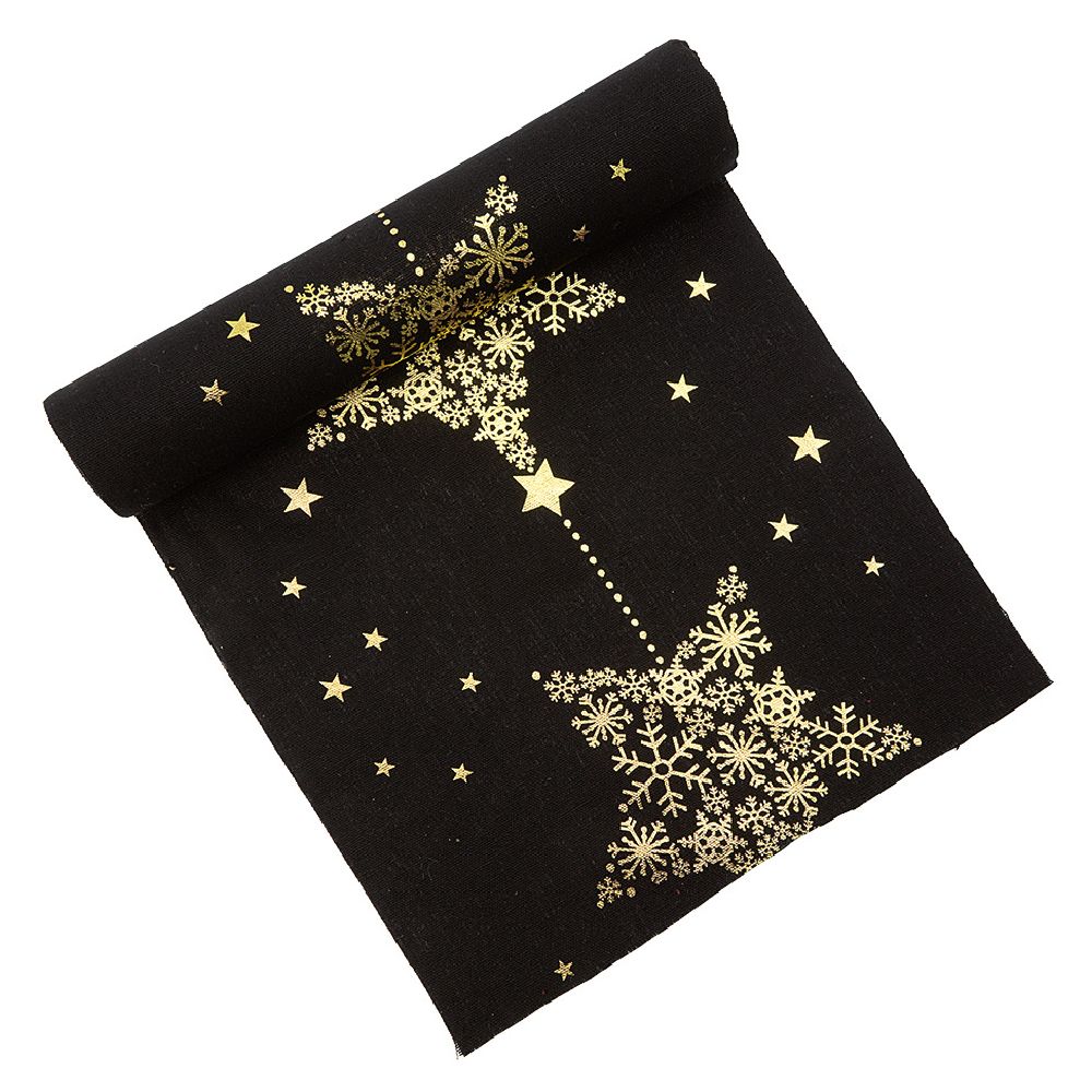Black fabric table runner with gold snowflake print, ideal for bringing a festive atmosphere to your end-of-year meal.