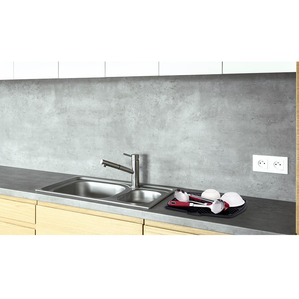 The advantages of this draining mat: - This mat provides extra space to dry your dishes when the sink is full - Its grooves prevent water from accumulating around your dishes - The notch in the front makes it easy to pour water into your sink