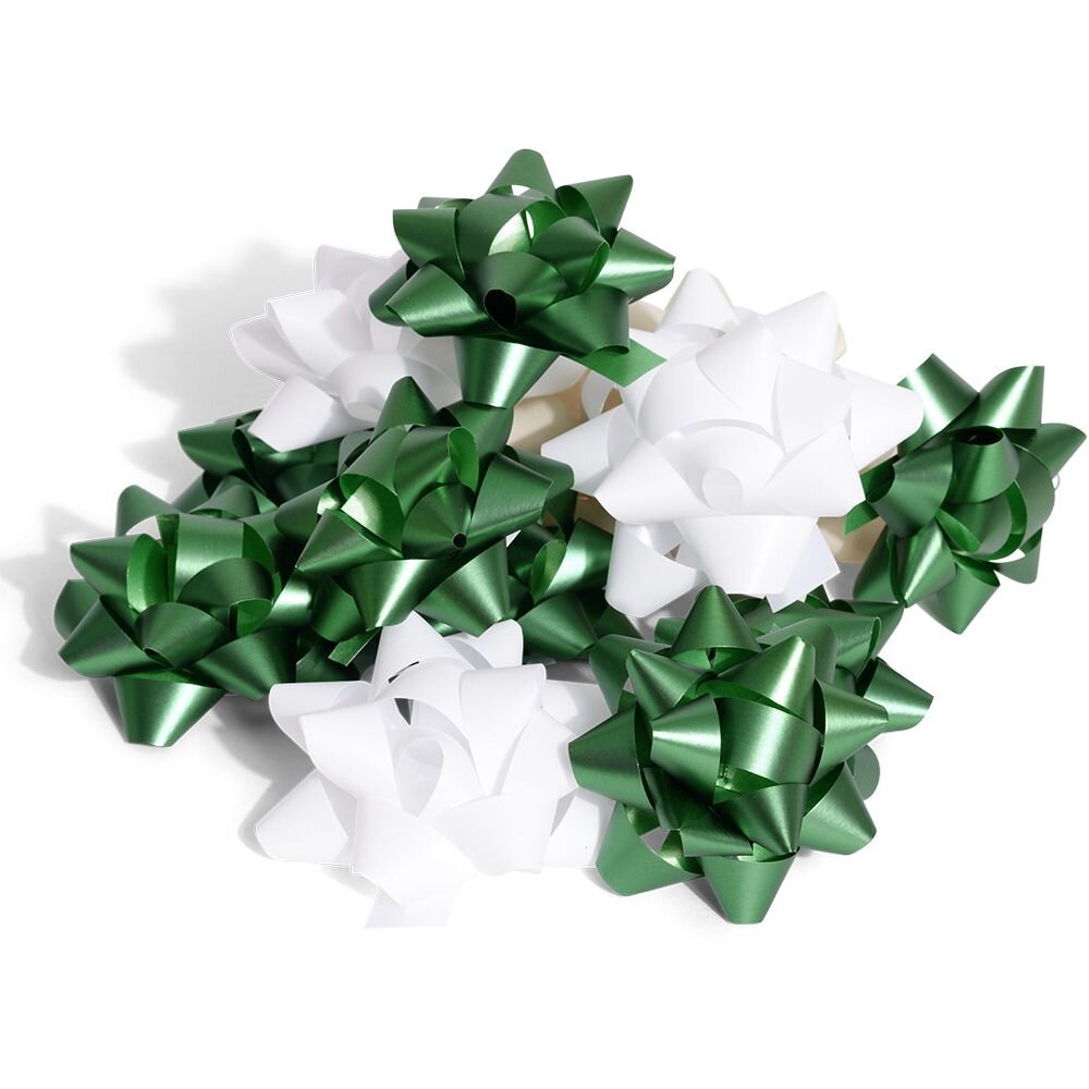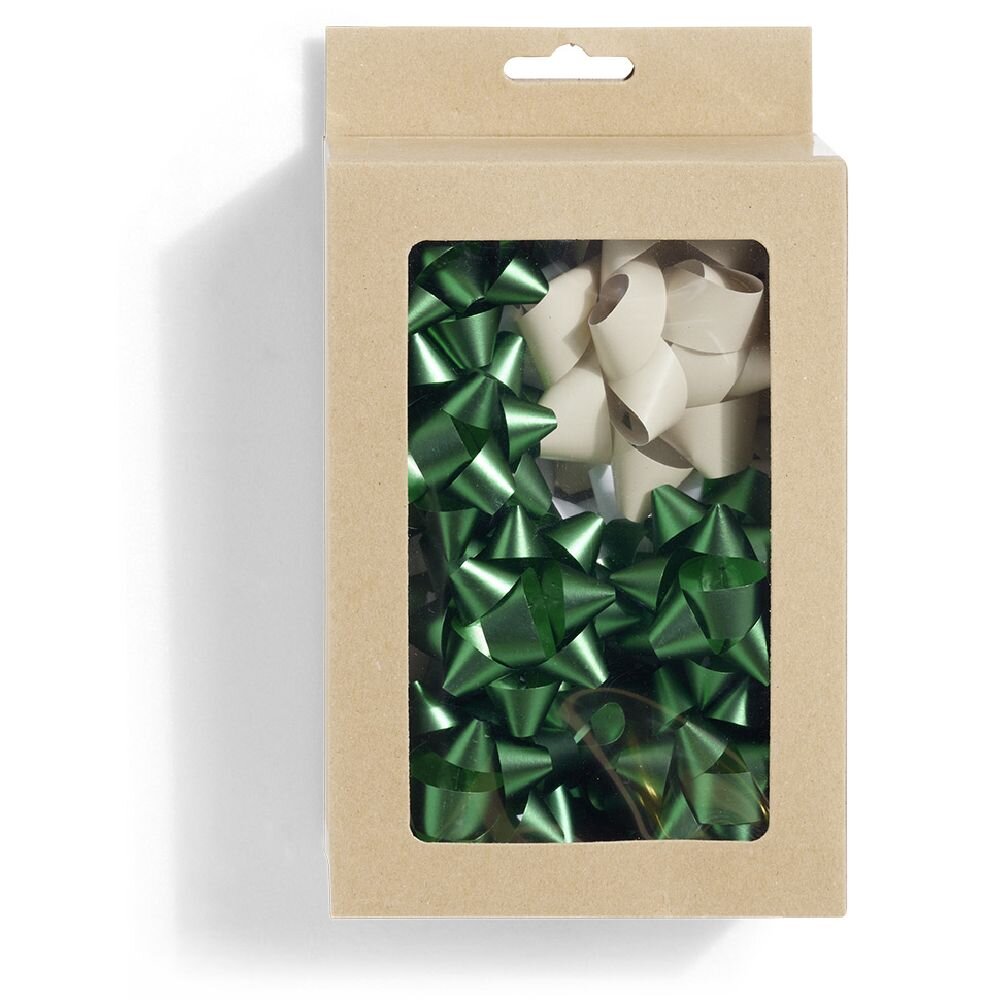 Cardboard box containing 12 ribbon bows in different colors and sizes, ideal for perfecting your gift wrapping.