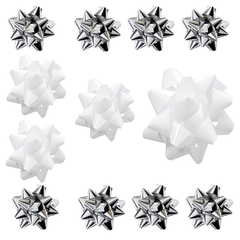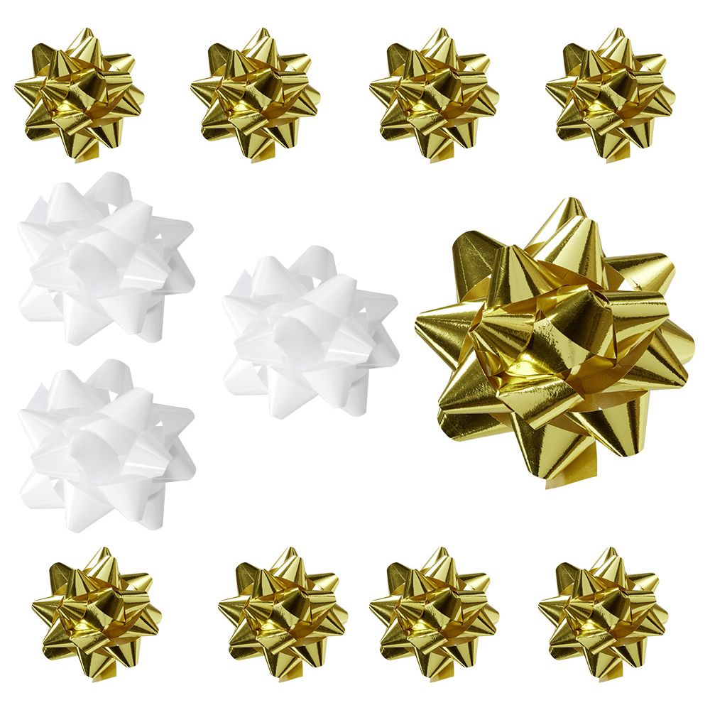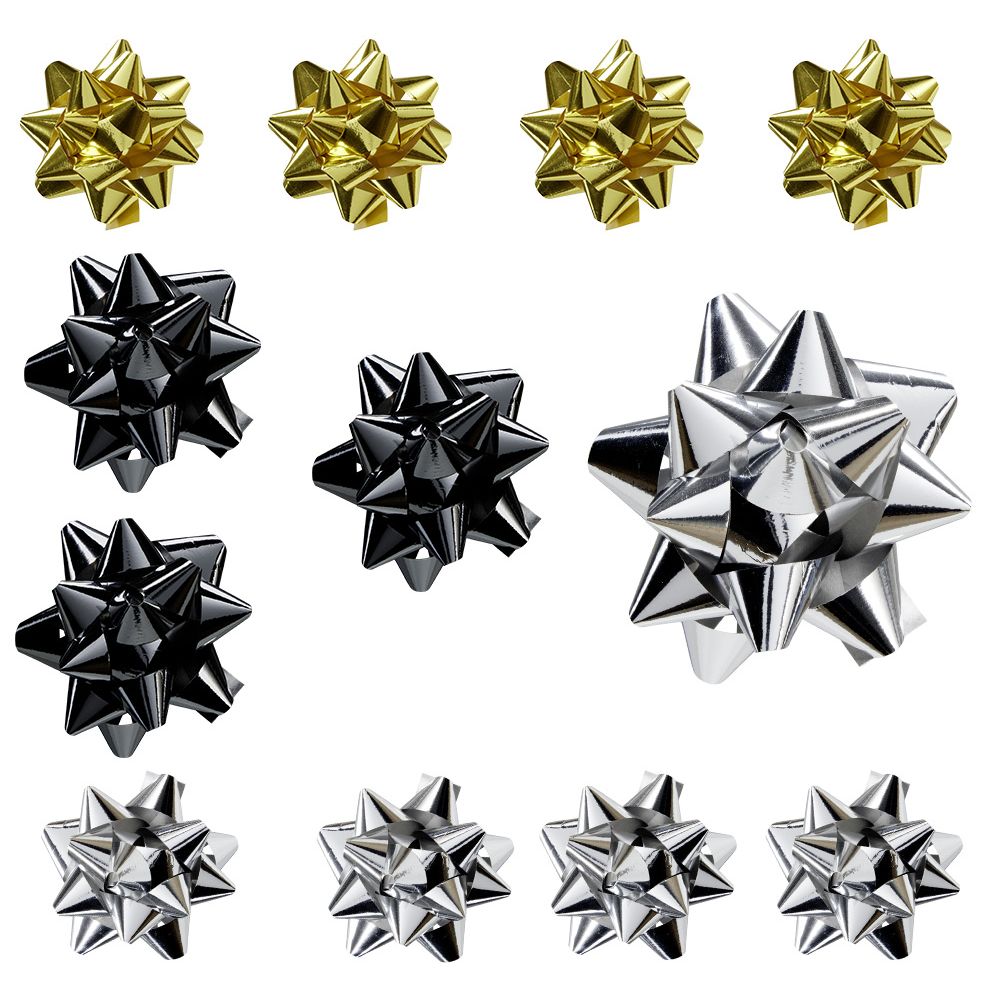 Cardboard box containing 12 ribbon bows of different colors and sizes, ideal for decorating your gift wrapping.