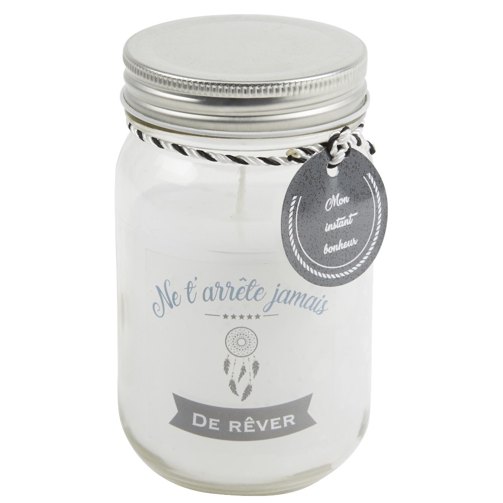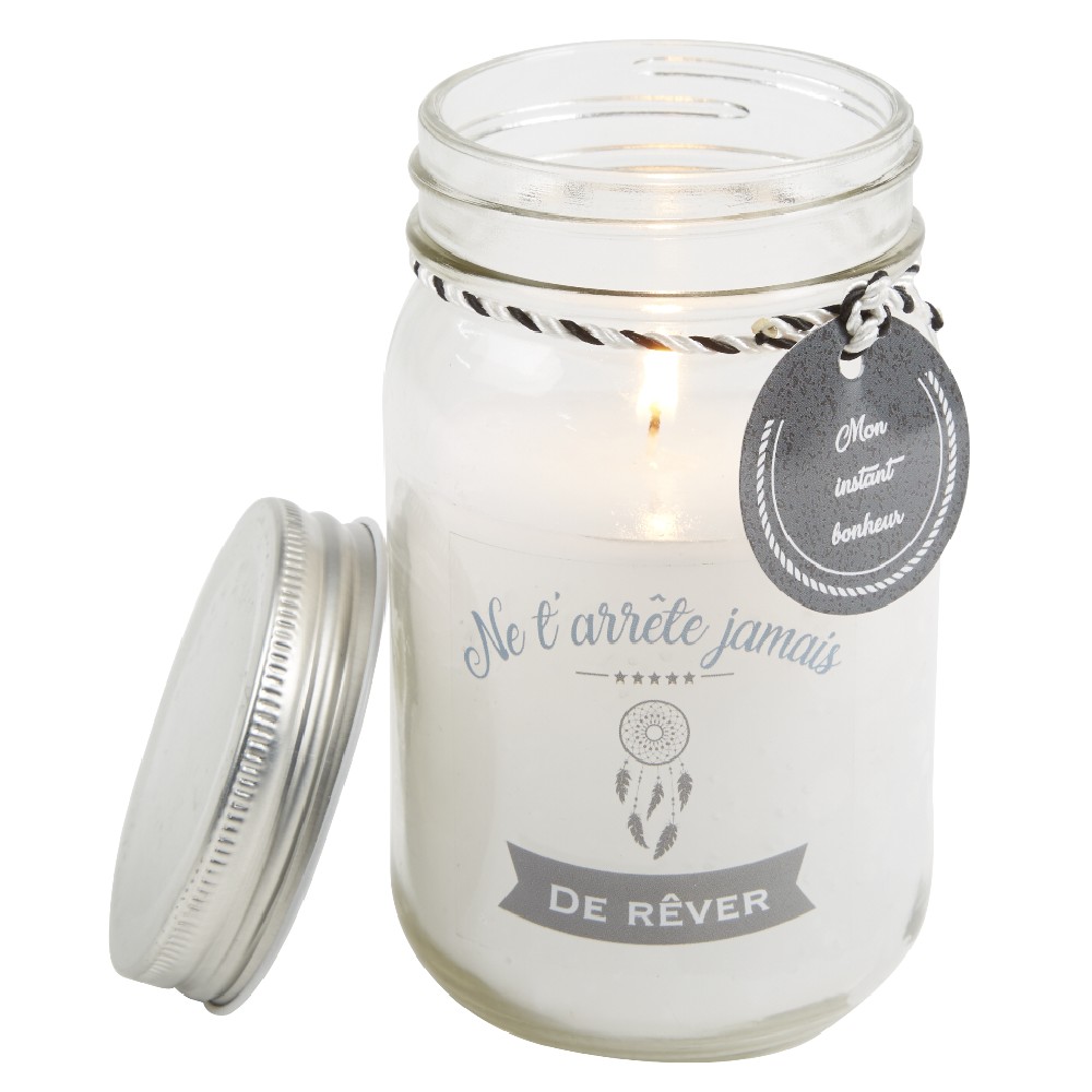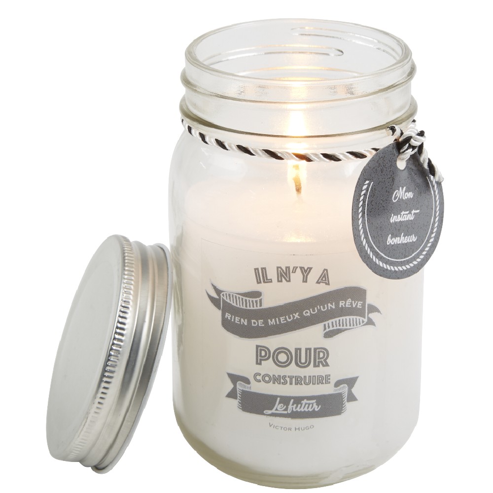 White "My moment of happiness" candle in a transparent glass jar with a gray lid.