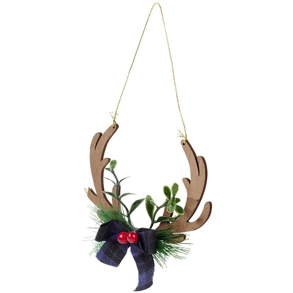 Plywood reindeer antler with a blue bow and holly branch, to hang in your home to bring a vintage style to your Christmas decoration.