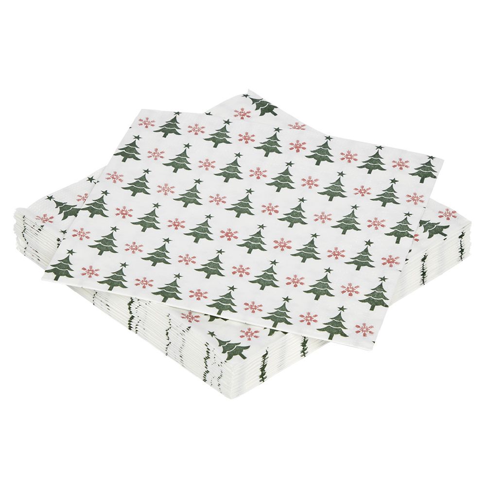 Pack of 20 disposable napkins with red snowflake and Christmas tree patterns to decorate your table for end-of-year meals.