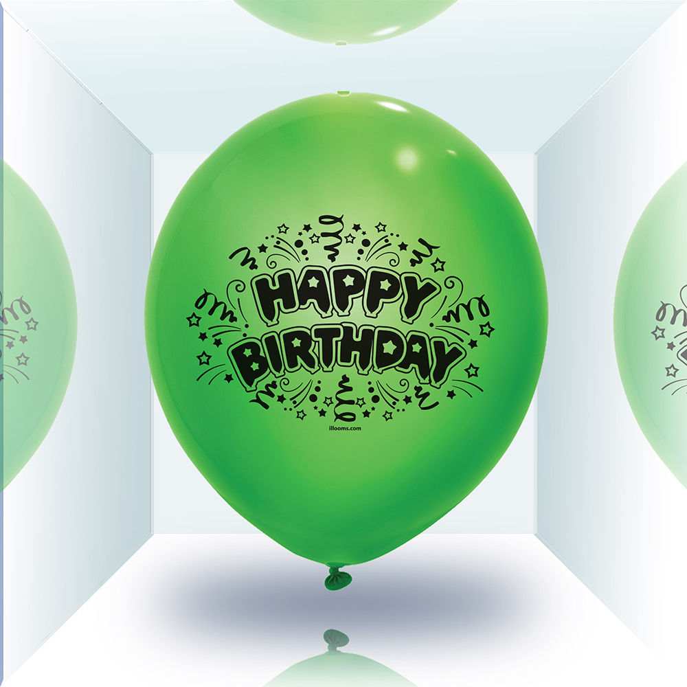 Set of 5 colorful LED latex balloons decorated with the words "Happy Birthday" for a bright and colorful birthday. The LED colors are purple, yellow, green, orange, and red and will light up the balloons for a duration of 15 hours.