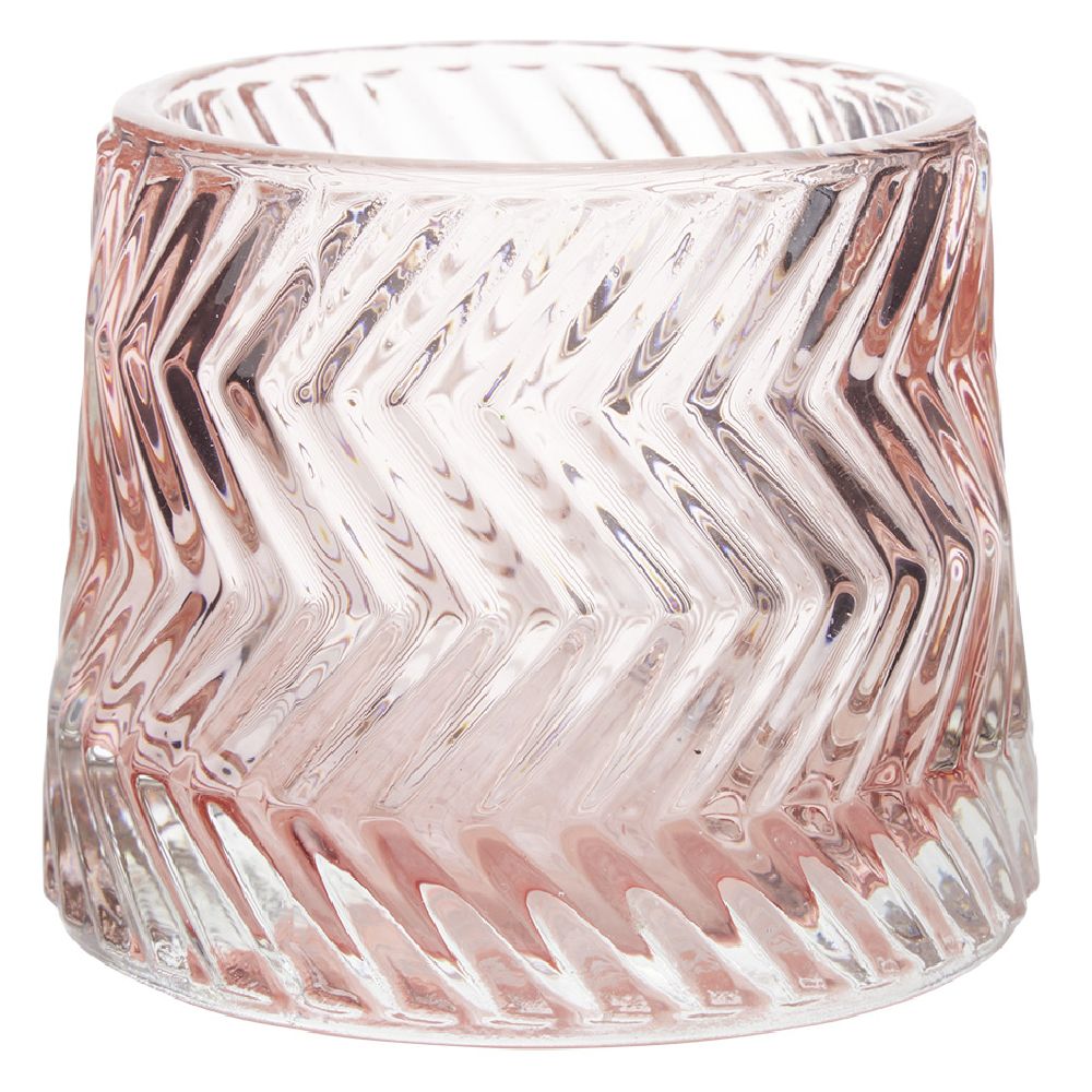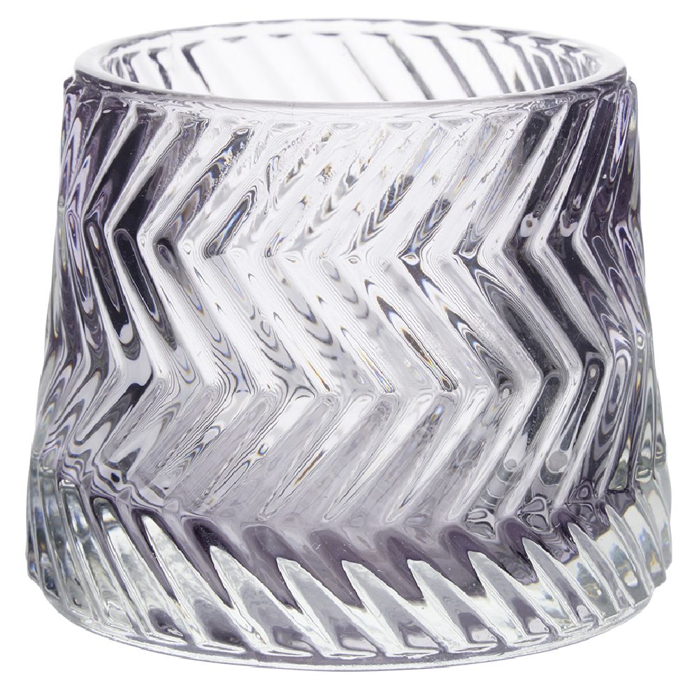 Glass tealight holder with raised zig-zag stripes.