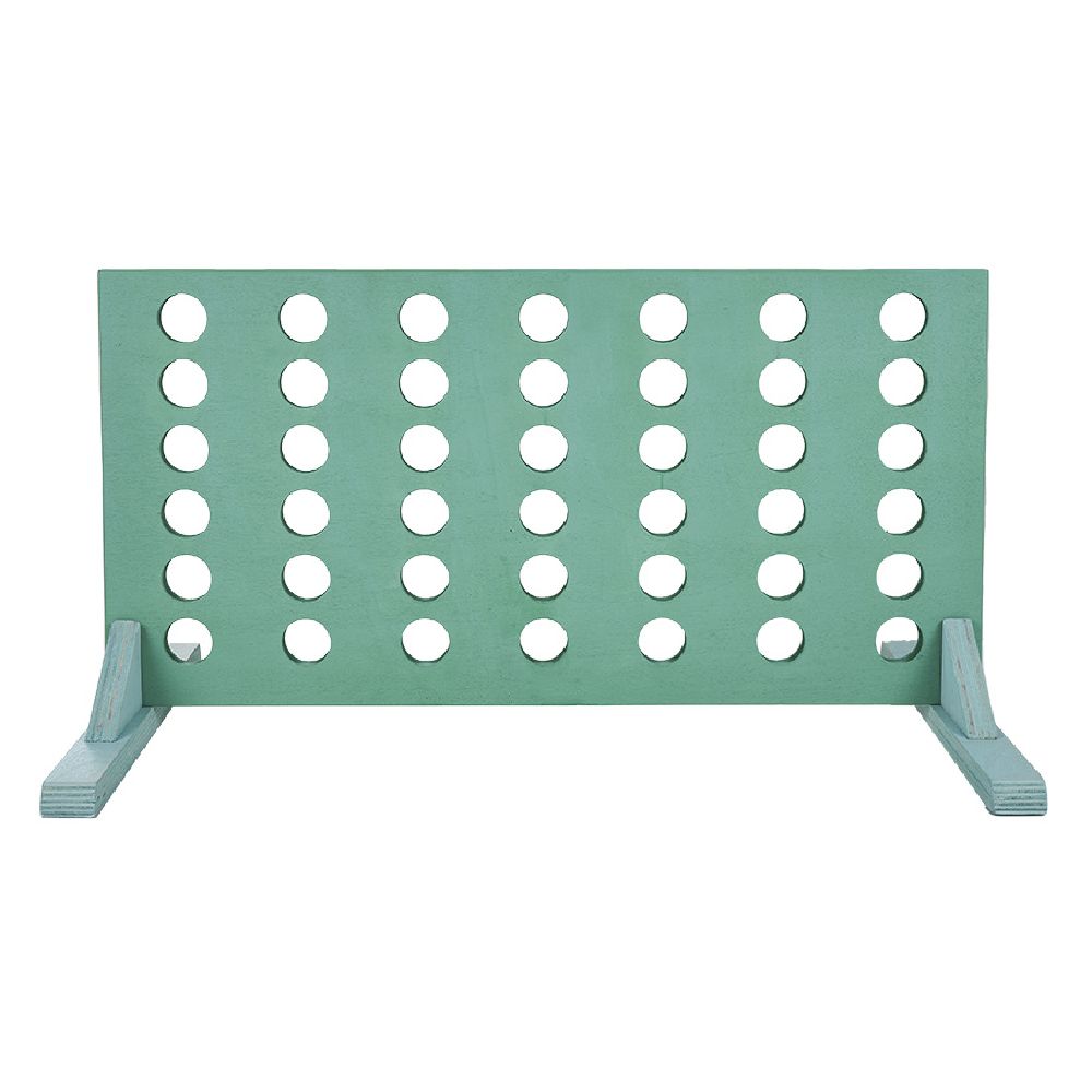 Four in a row XL wooden game containing 4 sets of tokens of different colors (yellow and green) for each player.
