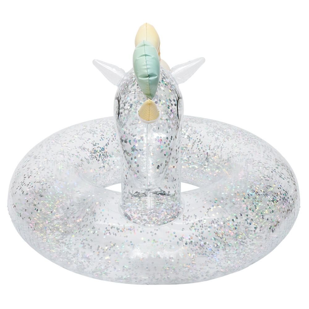 This transparent unicorn float with multi-colored mane and sparkling silver glitter interior is the ultimate accessory for floating in style!