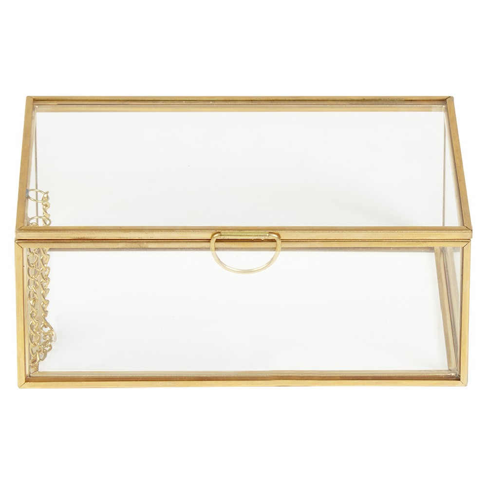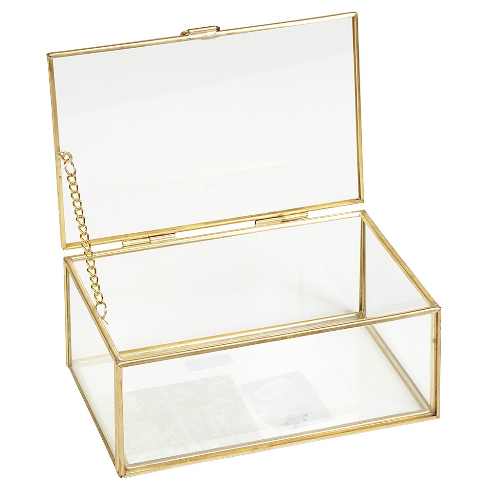 Clear glass storage box with brass trim.